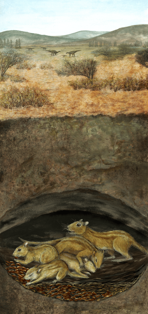Over the next three years, we discovered that all of the Egg Mountain multituberculates belonged to a single species (Filikomys primaevus), they consisted of both adult and subadult individuals, and their skeletons closely resembled those of modern burrowing mammals (like chipmunks). These facts, coupled with the way the specimens were preserved and the geology at Egg Mountain, indicated that these animals were likely nesting together in burrows when they died. Taken together, these specimens represent the most complete Mesozoic mammal material from North America, the first occurrence of adults and subadults preserved in close association, the oldest-known case of burrowing capabilities in a multituberculate, and the earliest evidence of social behavior in mammals.