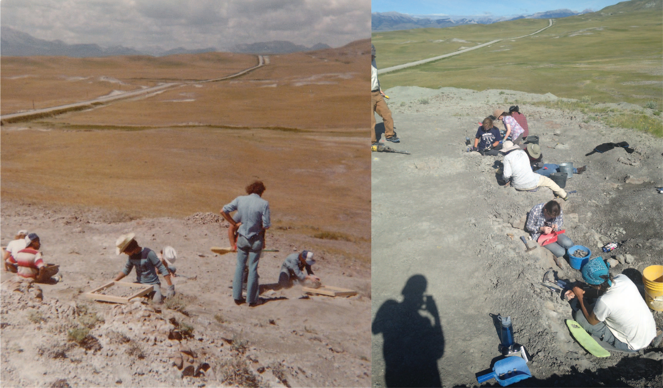 The Egg Mountain locality over the years. To the left, Jack Horner overseeing the Egg Mountain quarry in the summer of 1979. To the right, Dave Varricchio overseeing the same quarry in July of 2016. [Photo credit: Right, Jack Horner; Left, Willie Freimuth]