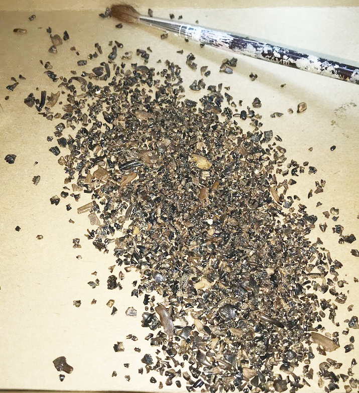 Tray of isolated multituberculate mammal teeth from the Judith River Formation, which is also in Montana and is similar in age to the Egg Mountain locality. Multituberculates are mostly known from these tiny and fragmentary bits, especially in North America, which is part of the reason the Egg Mountain multituberculate specimens are so exciting. These particular fossils are housed at the University of California Museum of Paleontology. [Photo credit: Luke Weaver]