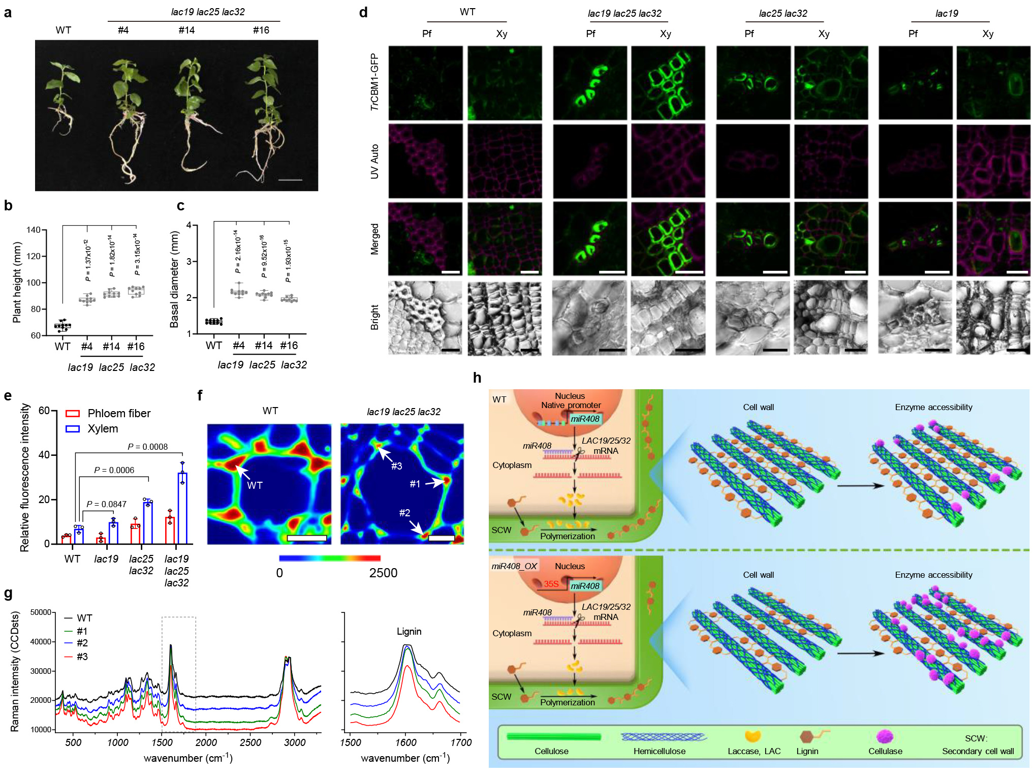 To investigate the target(s) of miR408 that influence cell wall structure and composition, we employed 5’ RACE and found miR408 targets LAC19,LAC25 and LAC32. We also generated the LACCASE loss of function mutants and the overexpression poplars. It is very interesting that the LACCASE loss of function mutants exhibit significantly increased growth and saccharification efficiency in xylem, similar with miR408 overexpression poplars (Figure 2a-d).