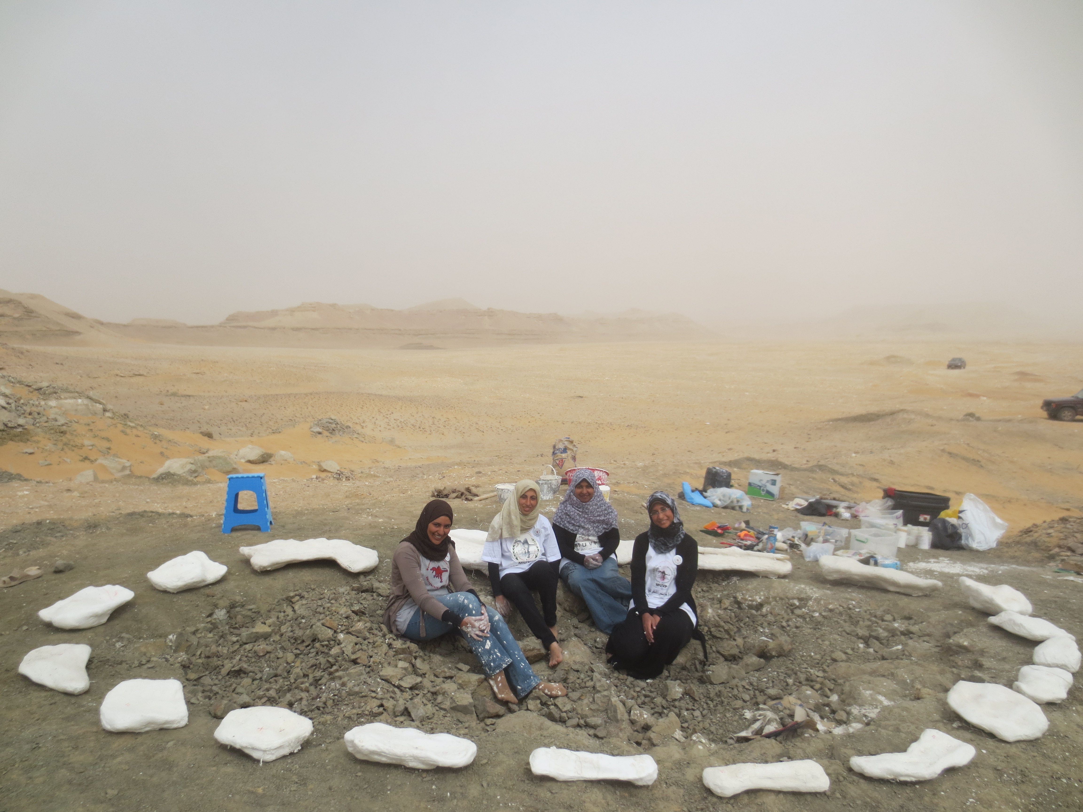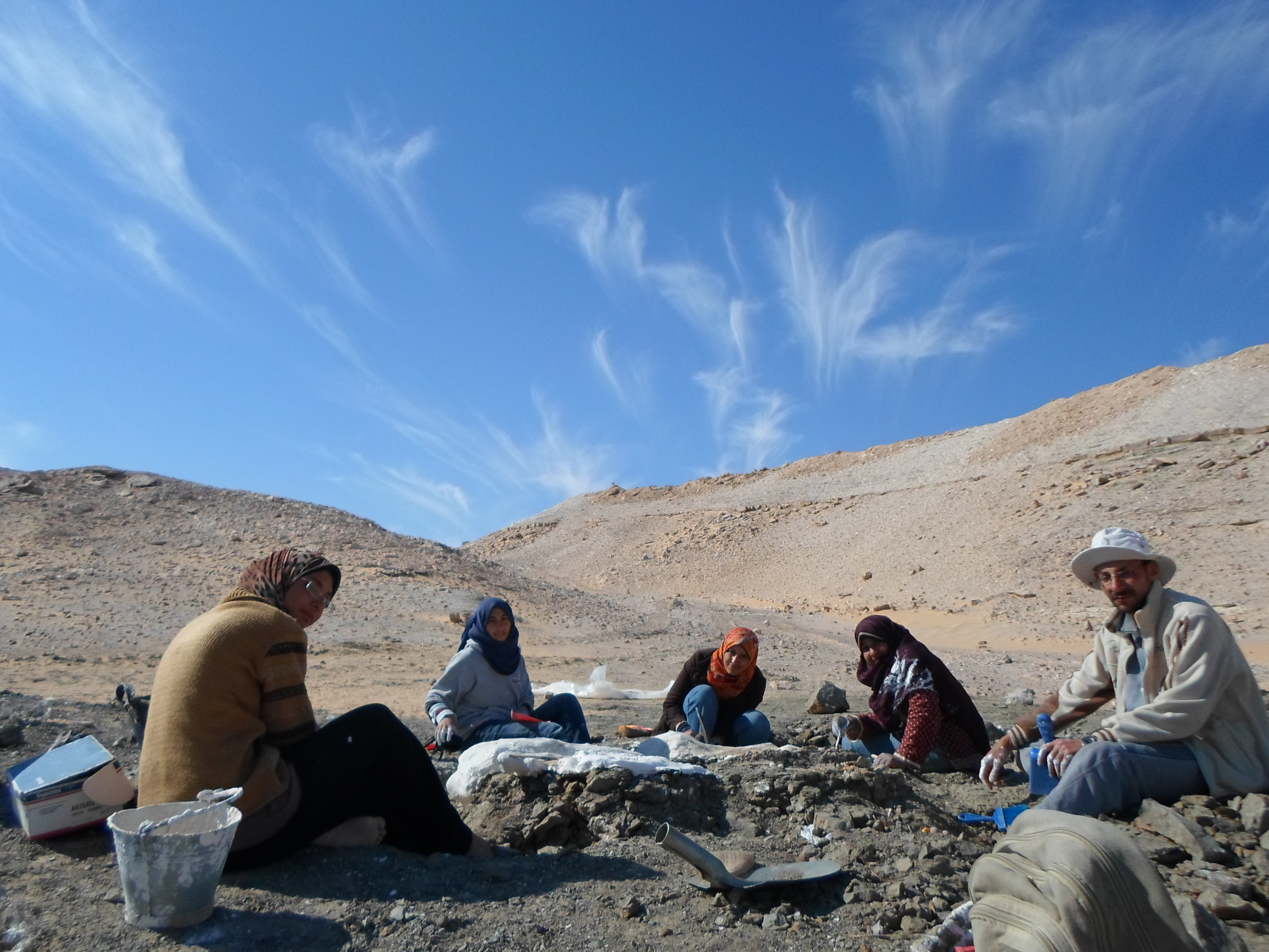 The story of the Mansourasaurus discovery began in December of 2013, when I received an invitation to give a talk about vertebrate paleontology at New Valley University in Kharga Oasis in southern Egypt. To get there I drove 12 hours with my graduate students from Mansoura University, Sanaa El-Sayed and Iman El-Dawoudi, who had just graduated and were eager to reach out to other Egyptian students about fossil vertebrates. On the way there we also picked up my third student, Sara Saber, from Assiut University. After the talk, we drove out to quickly have a closer look at the dinosaur-bearing rock exposures around Dakhla Oasis that I had been working in since 2008, with American colleagues from Ohio University, the University of Southern California, and the Denver Museum of Nature and Science. Our project aims to fill a ~30 million year gap in the Late Cretaceous fossil record of Africa, from which very few fossils of land-living vertebrates are known.