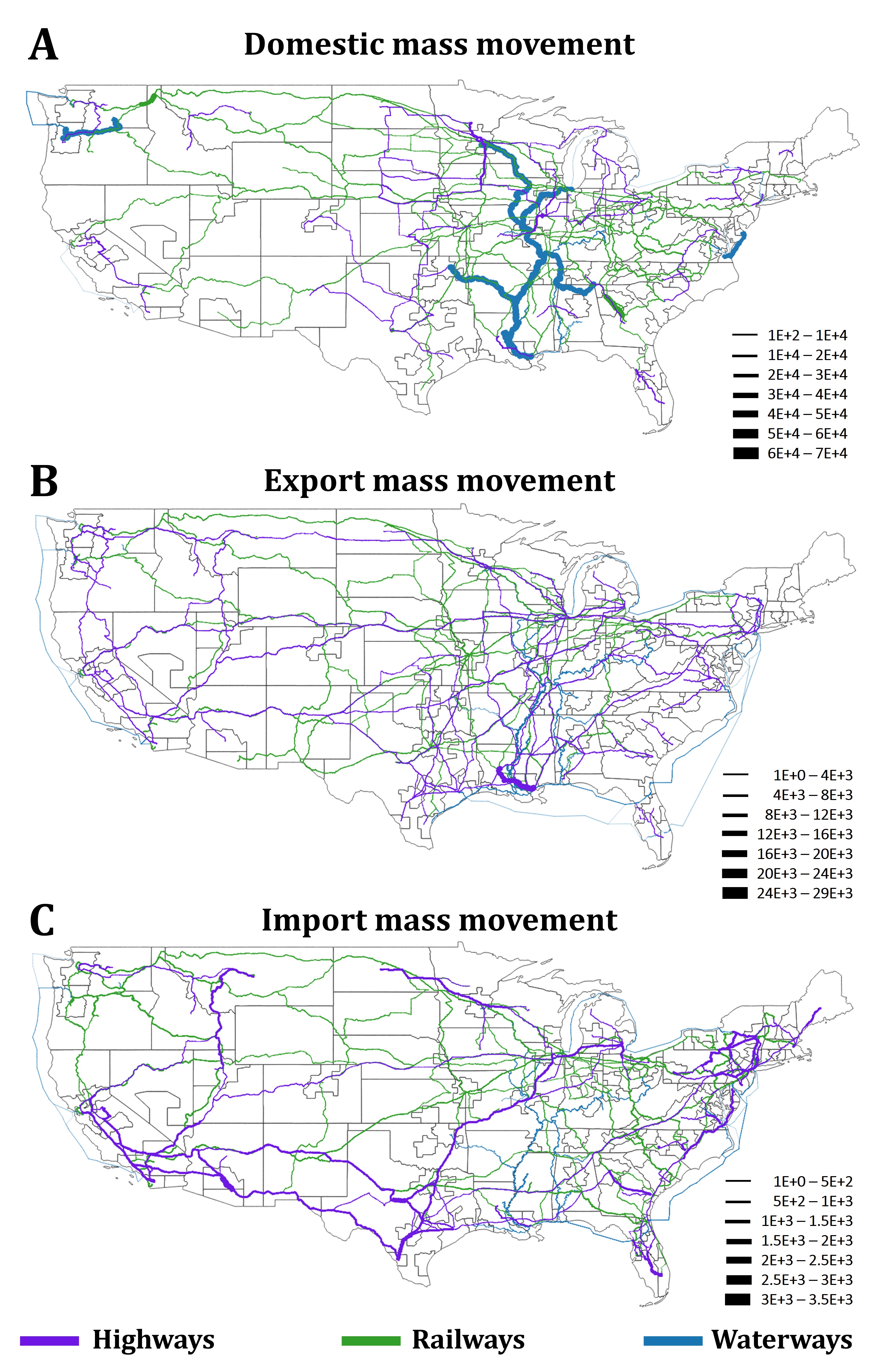 As seen in Figure 2, we find that highways along the U.S.-Mexico and U.S.-Canada borders are where majority of the agri-food transit takes place for imported goods. Also, highways that connect the nation to the Port of New Orleans carry significant amounts of agri-food that is to be exported abroad through barges. For waterways, imports seem to arrive to the ports in California whereas domestically produced and consumed goods almost solely move along the Mississippi River. For distributing agri-food commodities between their domestic origin and destinations, railways that connect East Coast to West Coast are very valuable as well as the railroads along the U.S.-Mexico border for imports and railroads along the U.S.-Canada borders for exports. In addition to Mississippi river transit, highways accumulated around the Midwest also carries major agri-food mass for domestic consumption.