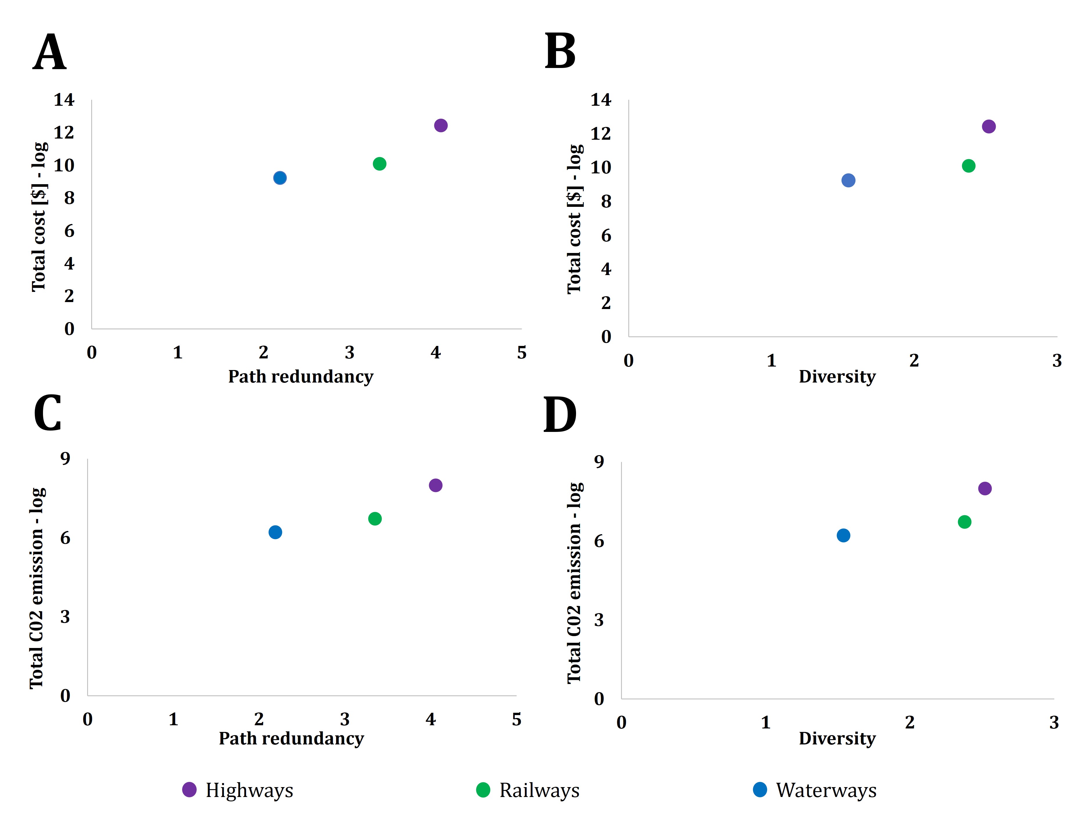 Figure 3. Tradeoff between agri-food transit cost, emission, and adaptability across highways, railways, and waterways. Highways have the highest total cost and emission, but they have multiple alternative paths that transit similar amounts of agri-food. In case of any disruptions, re-routing is highly flexible and supply-demand imbalance will be manageable. On the contrary, waterways have the lowest cost and emission which comes at the expense of being the most vulnerable against disruptions along the routes. Railways provide intermedium values of cost, emission, and adaptability in agri-food transit.