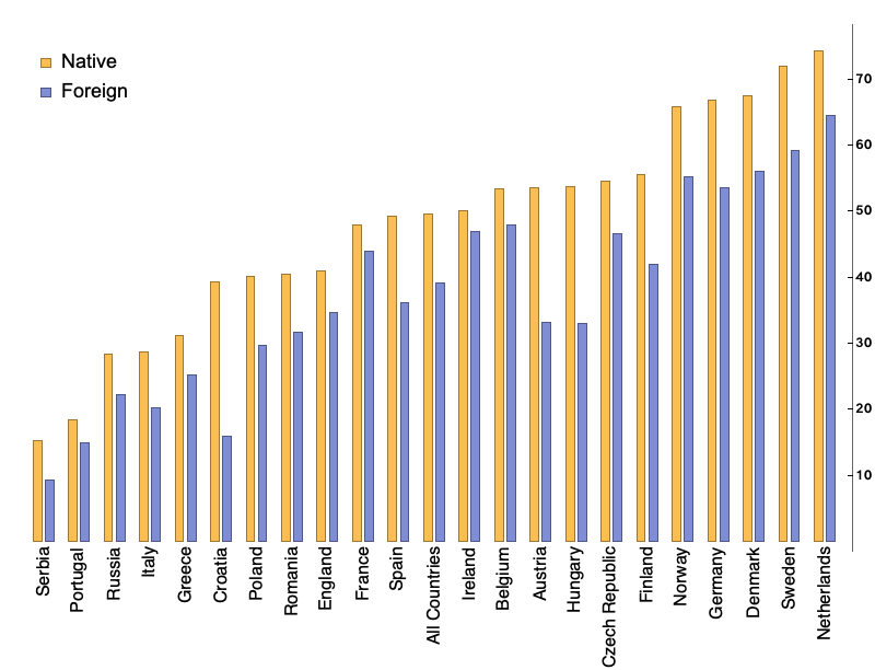 Long story short, individuals with foreign-sounding names have it more difficult to get a response from an amateur football club. On average, the response rate is approximately 10% lower for individuals with foreign-sounding names. We do observe differences by country. In some countries, the difference is below 4%, e.g., Ireland, France, and Portugal, and in some other countries, the difference is above 20%, e.g., Croatia, Hungary, and Austria. For most of the remaining countries, the response rate difference is between 5% and 13%. See Figure 2 below.