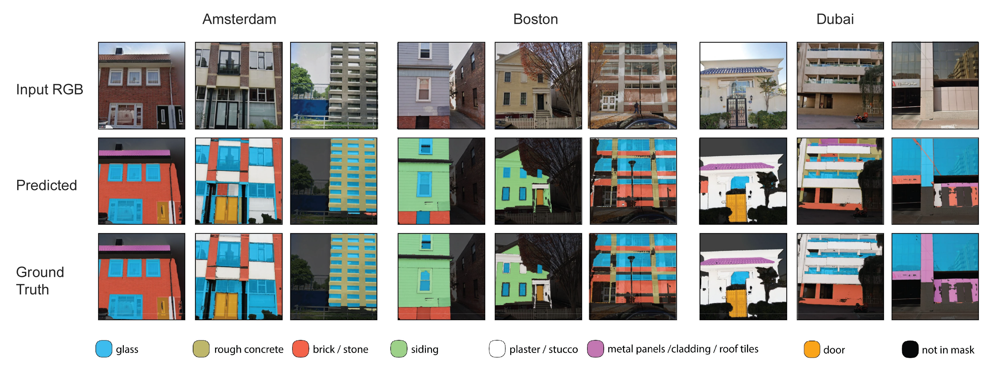 Materials that make up the urban fabric—brick, concrete, glass, plaster, and metal panels—play a critical role in determining local thermal conditions. Their properties, such as albedo (reflectivity), emissivity, and thermal mass, influence how much heat is absorbed, retained, and re-emitted into the urban environment. Cities experiencing increasing heat stress require detailed data on these materials to model the impact of design choices on outdoor thermal comfort, peak cooling demand, and urban heat mitigation strategies. However, the lack of large-scale datasets on facade materials has been a persistent barrier to integrating this knowledge into city-scale studies. Figure 1 illustrates examples of facade material segmentations across different urban contexts.