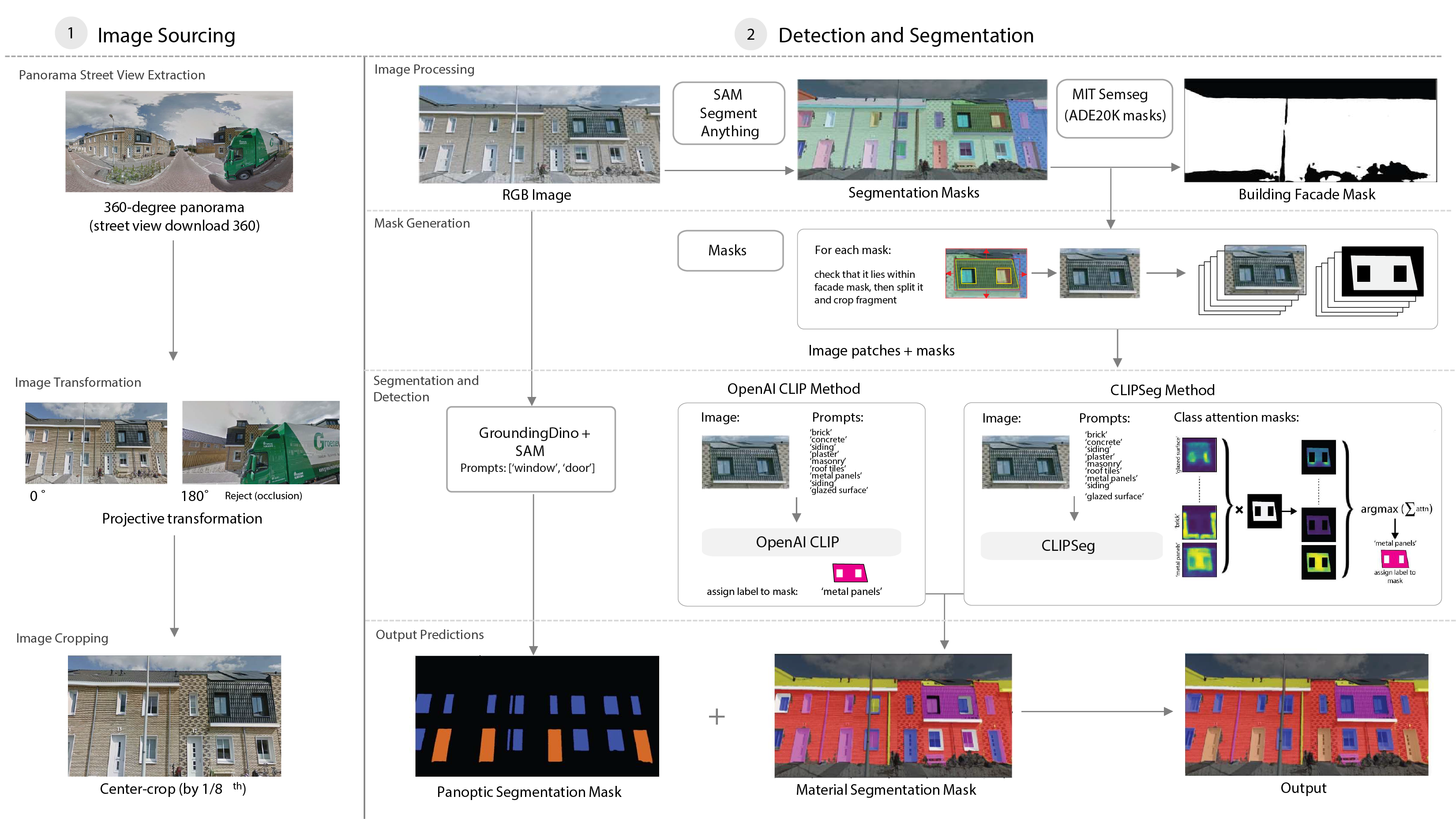 - Image Sourcing and Preprocessing: We extract high-resolution facade images from street-view panoramas, applying segmentation techniques (SAM) to isolate buildings from their surroundings and patch different segments.