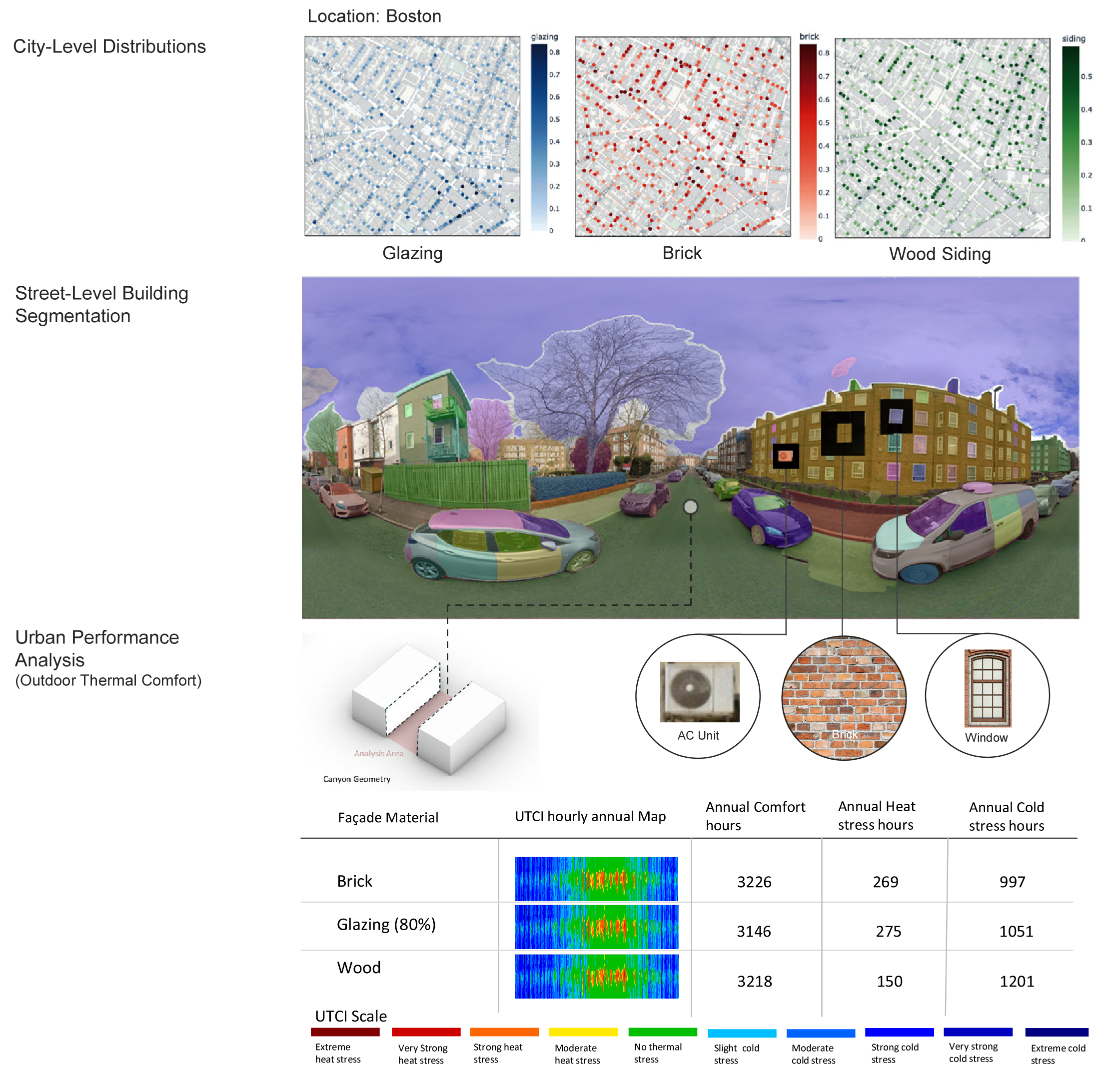 Figure 3: Full workflow outputs in Boston; from facade segmentation to thermal comfort assessment