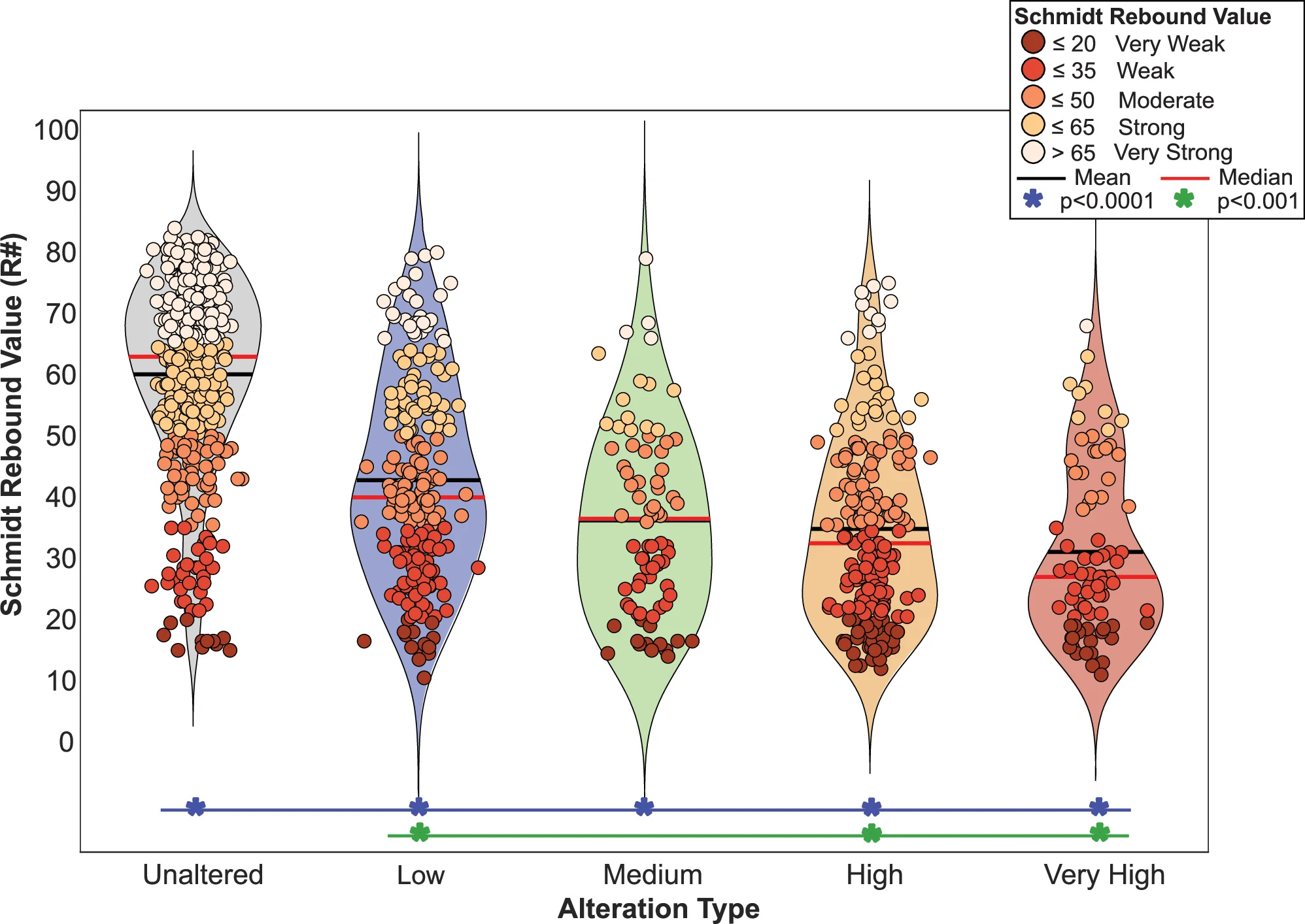 Fig. 2: The violin plot illustrates the Schmidt hammer rebound values distribution across different alteration types. The red line on each violin represents the median, while the black line indicates the mean. Data points (n = 1038) are color-coded by Schmidt rebound value, and the color of each violin corresponds to the alteration grades in Figs. 3–5. The width of each violin reflects the density of measurements. To assess statistical significance, we applied a non-parametric Kruskal–Wallis test, followed by Bonferroni-corrected post hoc pairwise comparisons. Blue line and asterisks indicate pairwise comparisons significant at p < 0.0001, and green lines and asterisks denote comparisons with p < 0.001.