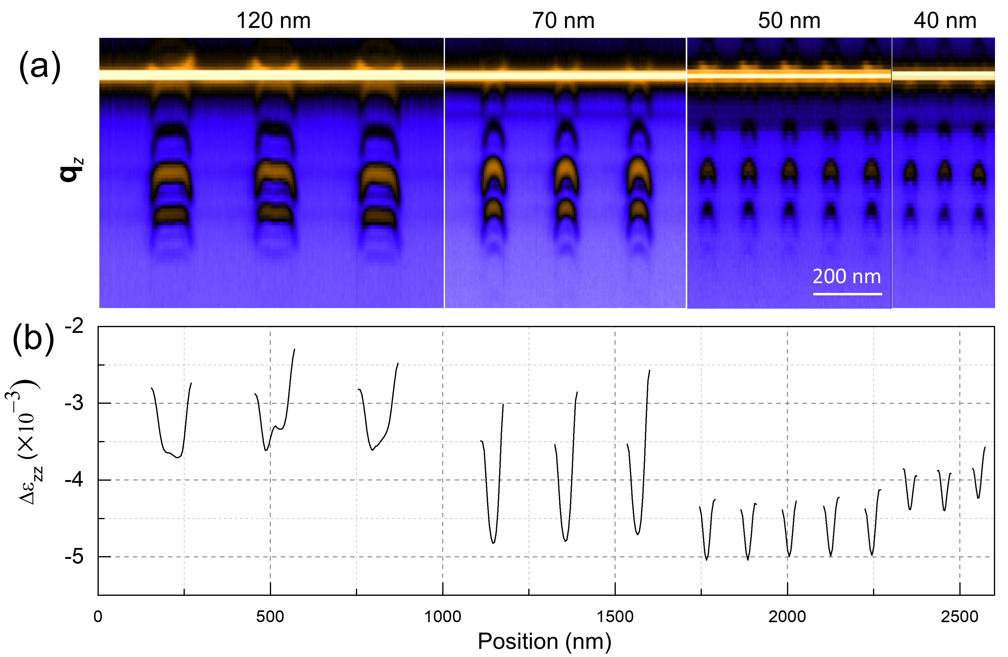 The results, as shown in Figure 3b, revealed two distinct modes of deformation within the nanosheets. As discussed in the manuscript, the first is due to elastic relaxation generated by the presence of the nanosheet’s lateral free edges, which we measured about 15 years ago (https://aip.scitation.org/doi/pdf/10.1063/1.1938277). However, these measurements allowed us to quantify a second mode induced by the interplay between the adjacent Si and SiGe layers impacting their deformation at a much finer length scale near the nanosheet edges. These trends were confirmed by computational mechanics simulations by IBM researchers, highlighting the importance of understanding both aspects of deformation at the nanoscale when predicting the carrier mobilities within current and future generation devices.