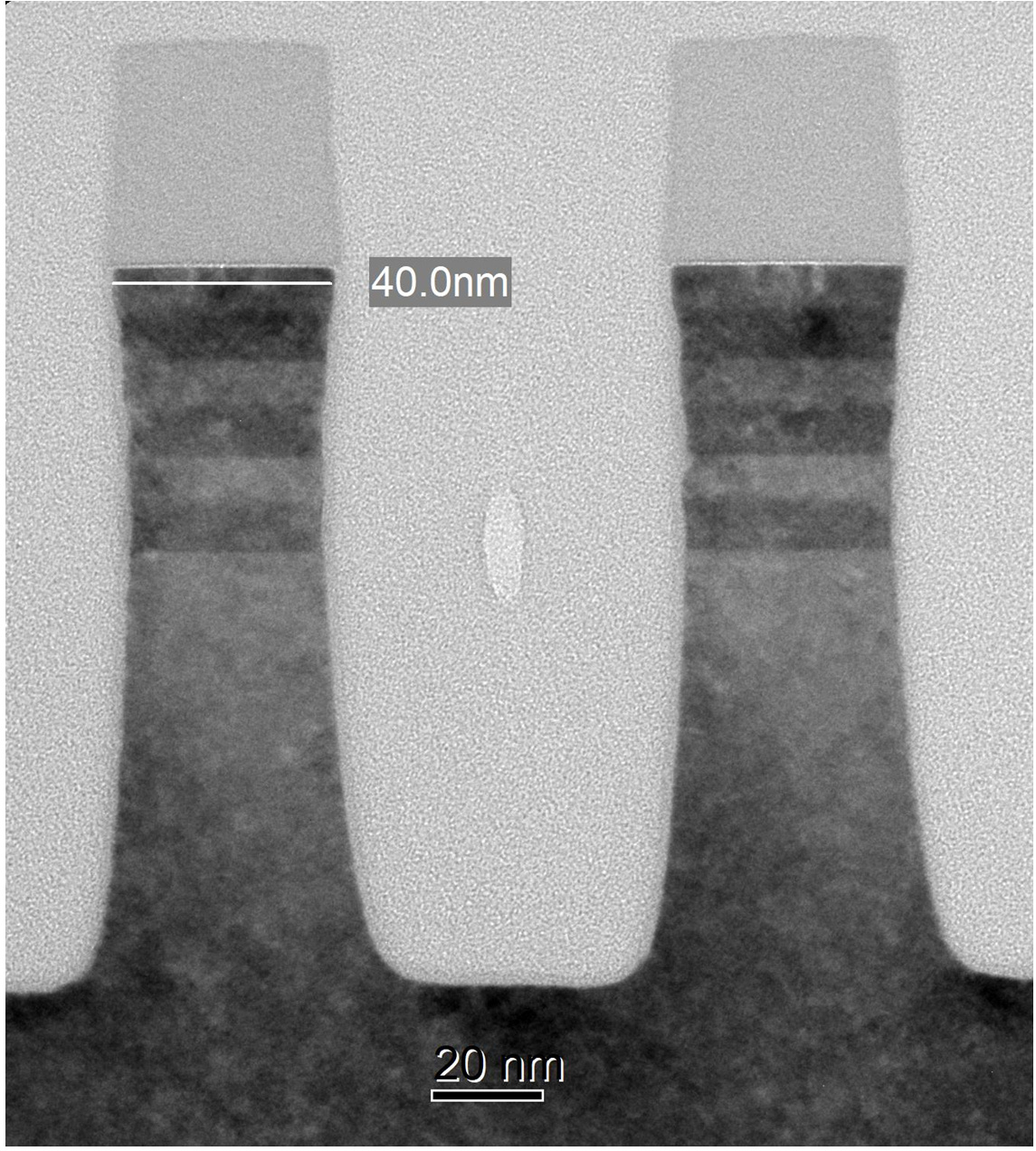 Another example has been the evolution from planar technologies to three-dimensional transistor architectures, such as FinFET’s, because the ability to control the threshold characteristics becomes more difficult as channel regions get smaller. The structures we investigated, as detailed in our manuscript, “Mapping of the mechanical response in Si / SiGe nanosheet device geometries” (https://www.nature.com/articles/s44172-022-00011-w) involve the study of nanosheets, the next generation of devices beyond FinFET’s to address the performance needs below the 7 nm technology node. By stacking fins vertically and employing a gate-all-around geometry, better device control can be achieved. However, experimentally verifying the strain states within these structures is critical due to their greater flexibility. At the same time, device scaling has also led to the issue of testing or surpassing the limits associated with the spatial resolution of many characterization techniques at our disposal. In fact, transmission electron microscopy is often used to image our devices because it possesses the necessary lateral spatial resolution (see Figure 1). However, the corresponding sample preparation is extensive, and the process of extricating a thin sample can alter the properties of the original material. This is particularly important as we consider the more complex device geometries where preserving their environment is crucial.