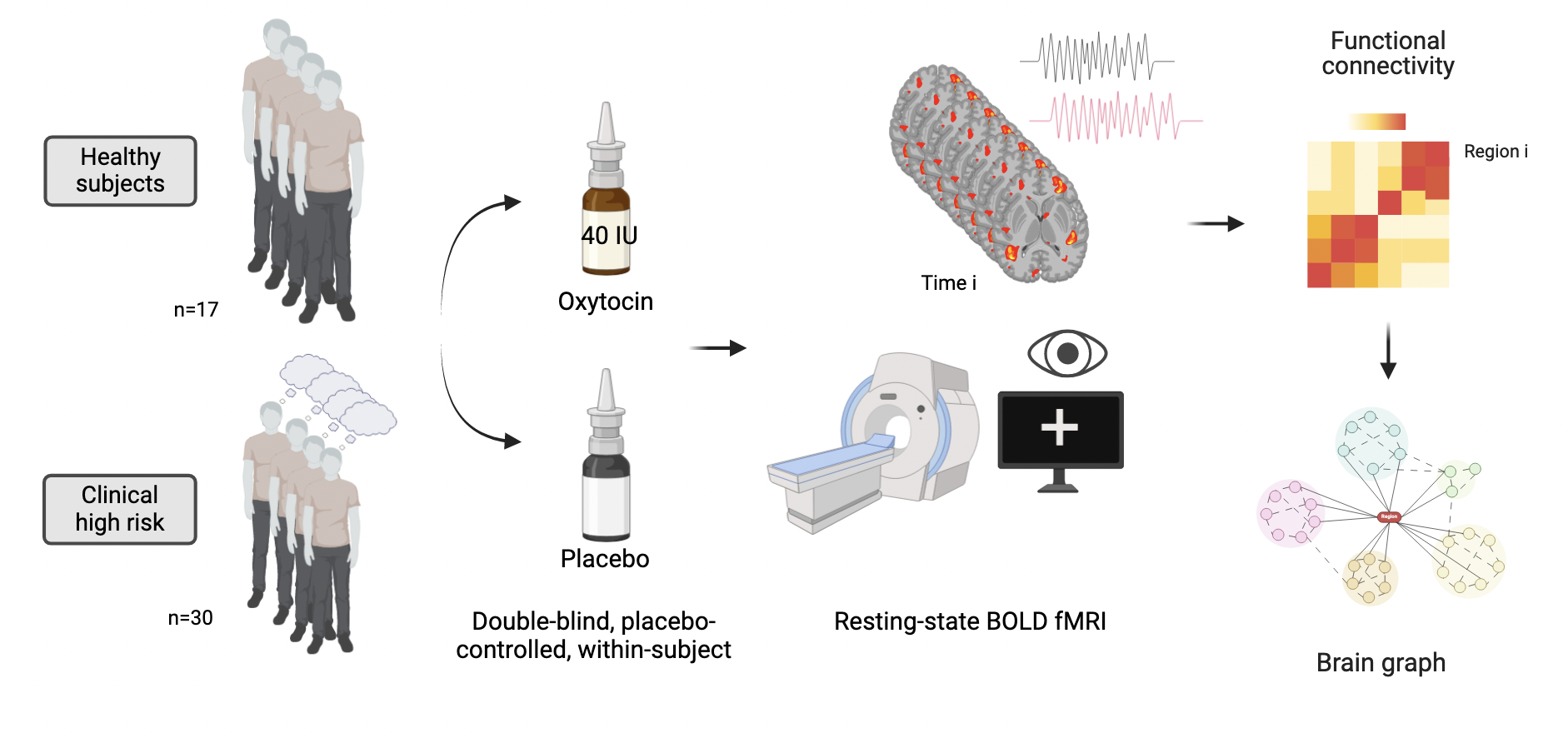 Psychosis is a complex condition which casts a shadow over the mental and physical health of many lives, and researchers and clinicians are continuously exploring new avenues for prevention and support. In our latest Molecular Psychiatry study entitled “Connectome dysfunction in patients at clinical high risk for psychosis and modulation by oxytocin”, we explore the merits of intranasal oxytocin as a potential candidate in psychosis prevention. We do this by testing whether, a “sniff” of this peptide administered to people at risk can modulate an important mechanism thought to contribute to the genesis of psychosis and result in alterations in the organisation of brain connections.