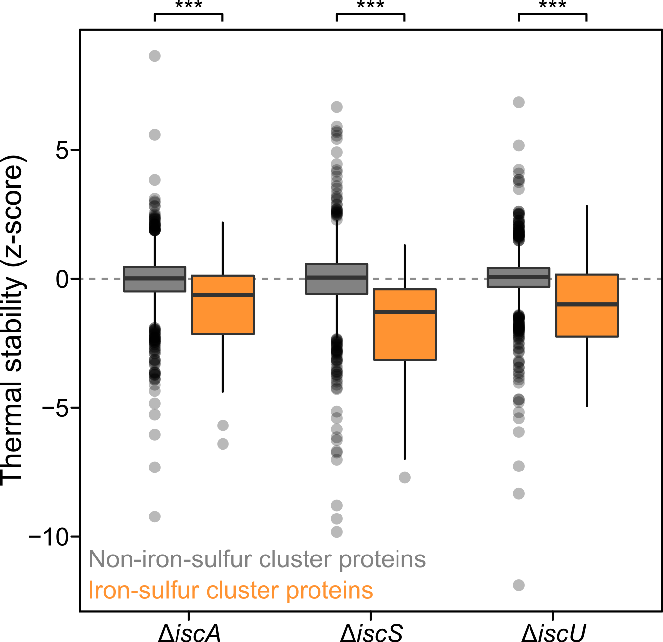 One way to look at the data is to look directly at the effects of a gene deletion on the proteome to infer its function. For example, in mutants of iron-sulfur cluster biosynthesis (ΔiscA, ΔiscS, ΔiscU) many proteins that bind this co-factor where thermally destabilized, since the cells cannot produce it. We also observed that enzyme thermal stability was correlated with the levels of the metabolites that bind it, allowing us to monitor the metabolic state of the cell.