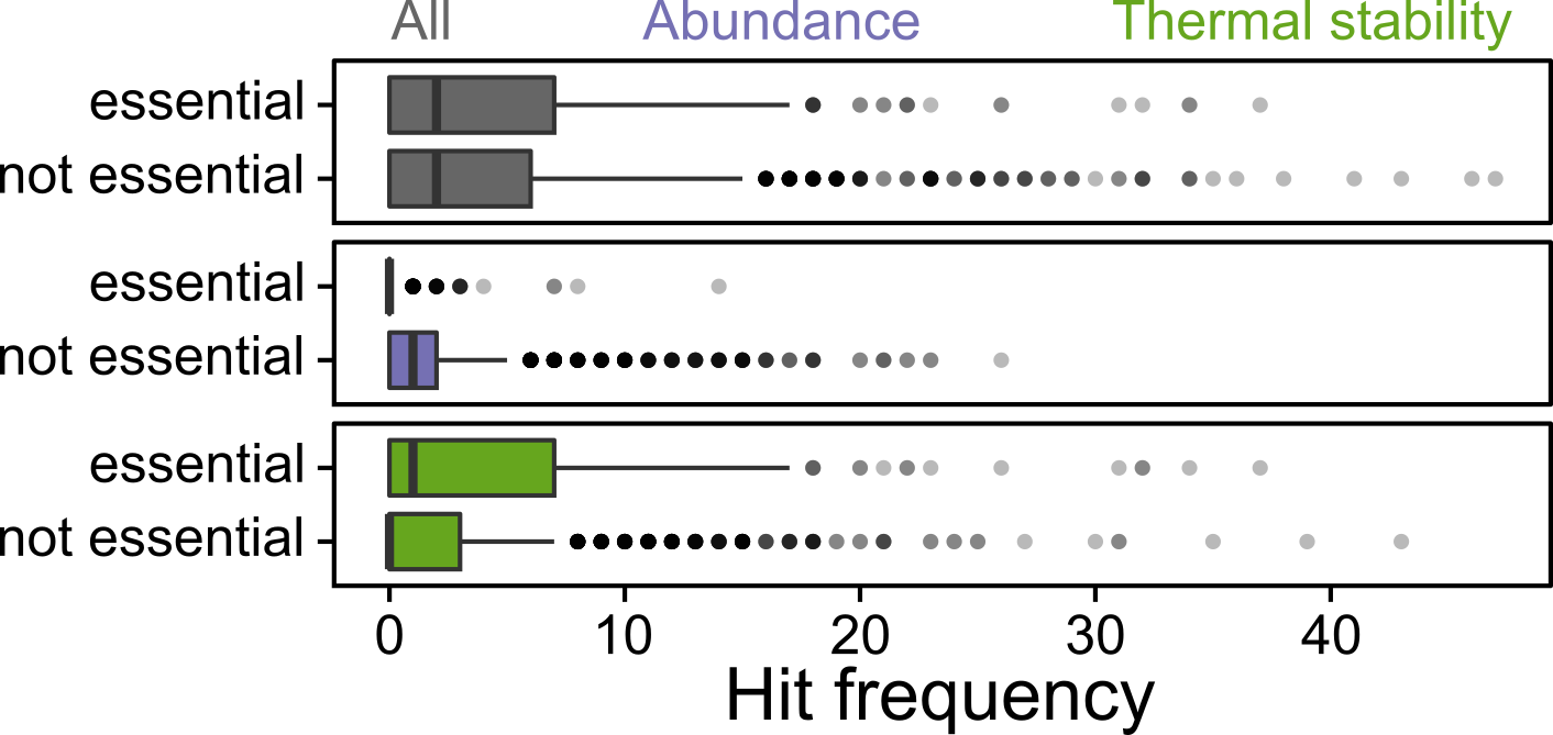 An interesting finding from our study was that proteins that are essential for life (i.e., cannot be deleted and thus are difficult to study with genetics approaches) rarely changed in their abundance, but commonly changed in their thermal stability. We showed that some of these proteins were more important in mutants that had changes in their thermal stability, since those mutants could not tolerate their downregulation.