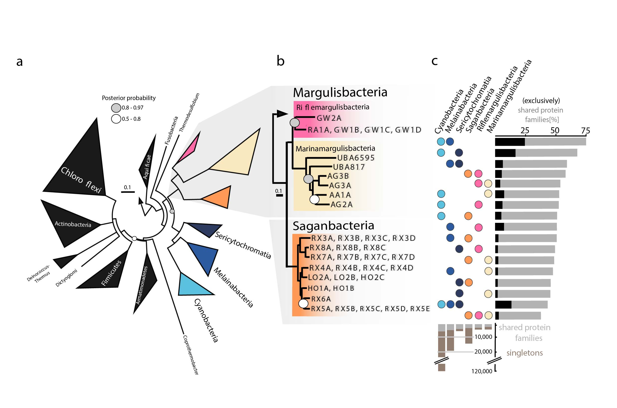 Figure 1. Phylogenetic tree based on 56 concatenated proteins and shared protein families. a. Location of Margulisbacteria and Saganbacteria in a de-replicated species tree of the Terrabacteria. b. Phylogenetic relationship of members of the Margulisbacteria and Saganbacteria. Support values are not shown at nodes with maximal support (posterior probabilities >0.97). c. Shared protein families among lineages: rows cover the total number of protein families shared among lineages and dots indicate which lineages are being compared. At the bottom, bars show for each lineage the total number of singletons (unique to respective lineage) in brown, and the number of protein families that is shared with one or more lineages in gray.