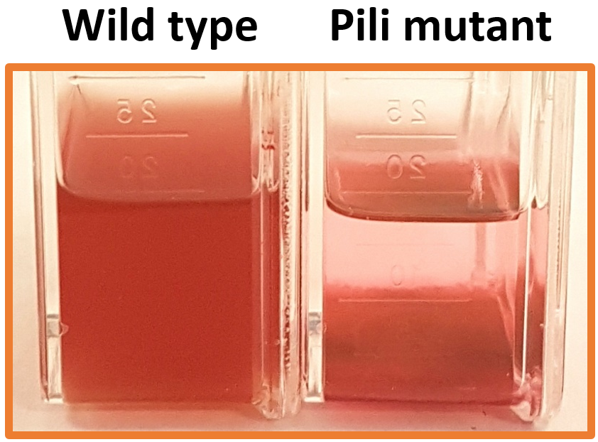 When mutant colonies were retrieved we were already planning a number of experiments to determine the function of these pili as, to this point, we had no idea why marine cyanobacteria would produce them. There were a lot of experiments planed, but while we were growing up the mutants in liquid cultures, the phenotype became pretty obvious (Fig 3)! The mutant cultures consistently sank and they were no longer capable of retaining their planktonic form unless cultures were shaken. As Daniel Sher (@MCE_lab) mentioned in a Tweet, pili in marine cyanobacteria function as pico-parachutes. Apart from increasing drag and avoiding sinking, the rapid extension and retraction of pili allows cells to retain an optimal position in the water column (e.g. nutrient hotspots, optimal light position), a clear advantage versus those that cannot produce pili and randomly drift in the water. We further demonstrated another environmental advantage to producing pili, as these appendages allowed the cyanobacterium to avoid being preyed upon by grazing organisms. Do grazing organisms get entangled in these long pili? How cool would it be if we could image it!