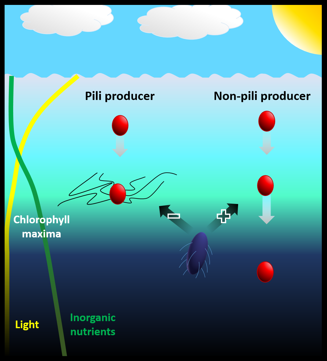 Text books tell us that type IV pili –proteinaceous extracellular appendages, which look like cables and that are made by a wide range of bacteria– are mainly involved in some kind of attachment, i.e. surface motility and biofilm formation or conjugation and DNA acquisition. But why would purely planktonic organisms such as marine cyanobacteria, which grow in environments where surfaces are rarely encountered and that are poor at taking up DNA, produce these nitrogen-expensive structures? In our paper we define a new function for these fascinating appendages: Pili allow planktonic cyanobacterial cells to retain an optimal position in the water column as well as evade predation by grazers (Fig 1).