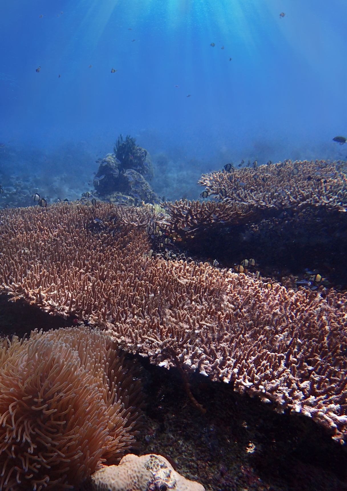 Corals in a large marine ecosystem near Sipadan, Malaysia. Coral bleaching is partly caused by marine heatwaves, resulting in ultimate destruction of the ecosystem. Courtesy photo: Dr. Yu Zhao.