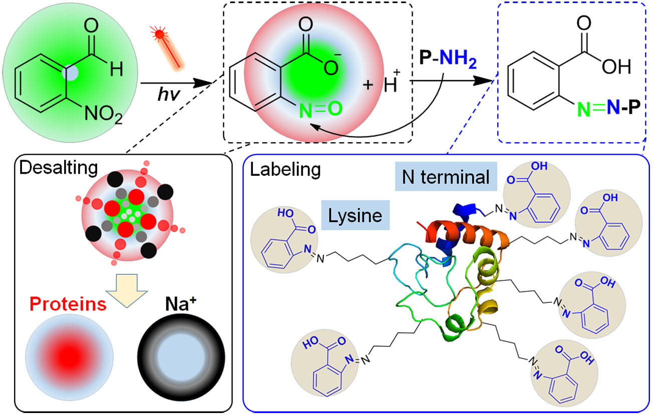 Simultaneous protein identifications and their structural probing are frequently beset with tedious, multistep and structural perturbing sample preparations. The resultant relatively independent workflows for each other have thus discouraged their applications in rapid and reliable probing of biological and medical events. In this work, we are presenting a “Two-Birds-With-One-Stone” photochemical strategy for a trade-off between large protein structural probing and on-demand matrix removal (Figure 1). The nsPCR is designed to enable simultaneous high-throughput, highly efficient protein labeling and on-demand matrix removal at nanosecond timescale and micrometer confined environment. The labeling occurs between the nsPCR product, 2-nitrosobenzoic anion (NS-), and primary amine groups at the N-terminal and lysine residues of proteins. The on-demand matrices removal benefits from the composite effects of local pH-jump effect, photochemical microscale electrophoresis and microscale thermophoresis. The labeling efficiency for various sample types has been demonstrated to be as high as 90% with a high-throughput feature. The nsPCR has revealed the stabilizing effects of terminal sialylation on glycoprotein 3D structures for the first time, which offers unique features and capabilities that cannot be readily achieved using a typical gas-phase structural analysis tool, ion mobility-mass spectrometry.
