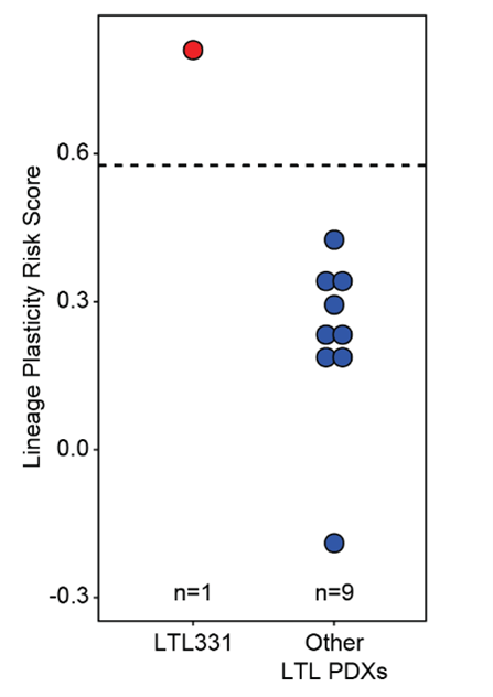We previously determined the effect of surgical castration on risk of lineage plasticity in a collection of human patient-derived xenografts (PDX) tumors. Only one tumor, termed LTL331 undergoes castration-induced lineage plasticity14. Importantly, our lineage plasticity risk signature was highly expressed in LTL331 vs. the other PDXS (Figure 3). These results strongly suggest that the signature we identified is linked to poor patient outcome and risk of lineage plasticity upon AR inhibition.