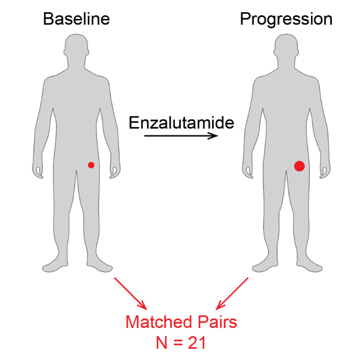 Development of resistance to targeted therapies is nearly universal in cancer treatment. However, there is an incomplete understanding of resistance mechanisms for most cancer therapies due to the paucity of data utilizing matched biopsies from patients treated with these agents. For patients with prostate cancer, androgen deprivation therapy with drugs like the androgen receptor (AR) inhibitor enzalutamide (enza) is the principal treatment approach, but much remains unknown about how this drug stops working.