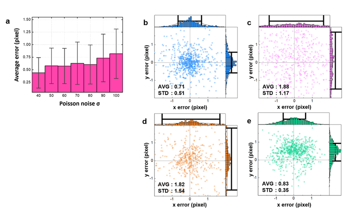 We conducted the accuracy test on the atomic positions acquired from simulation images with various noise levels and our proposed method shows a sub-pixel accuracy in average, even with the high Poisson noise (Fig. 2a). The same evaluation was conducted on other reported programs (Fig. 2b-e) and only 2D Gaussian fitting with PCA noise reduction (Fig. 2e) had comparable performance with our proposed method (Fig. 2b), while the former had a bias on y-axis.