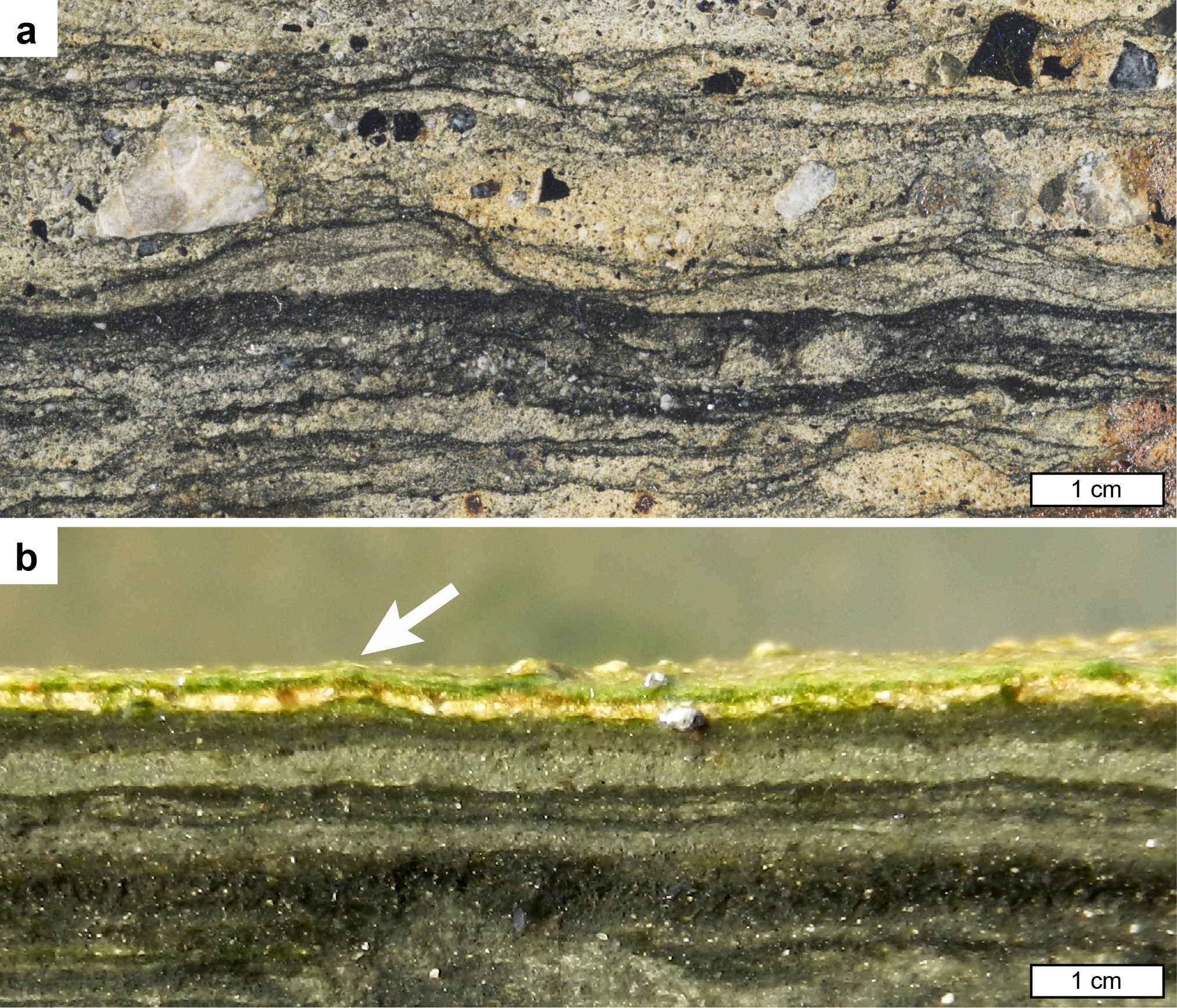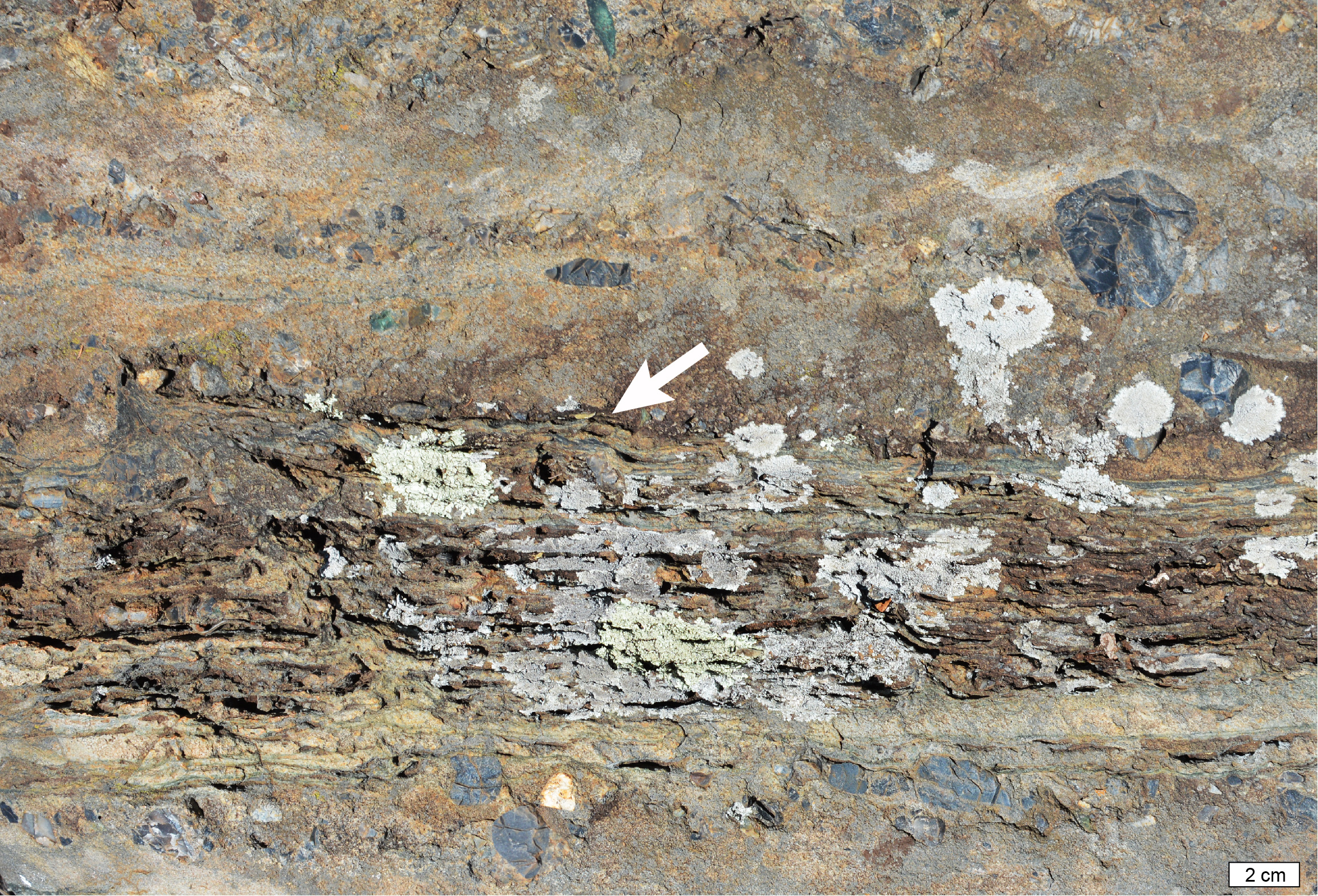 During my second BGB field campaign in 2012, the local wildlife ecologist and park planner Tony Ferrar guided us to some beautiful outcrops well hidden behind a locked gate on the private property of the Dycedale Syncline. In the Moodies Group, fossil microbial mats occur commonly in association with medium- to coarse-grained tidal marine sandstones (Homann et al., Prec. Res., 2015), but in the Dycedale Syncline they were interbedded with fluvial conglomerates and gravelly sandstones, once deposited in an ancient river bed (Figs. 2 and 3). I had never seen this association before in the BGB. These sedimentary deposits had been already described in the literature as recording a terrestrial to marine transition, however, their fossilized microbial mats were not recognized. I knew that these outcrops were clearly unique, but their significance had yet to be fully uncovered.