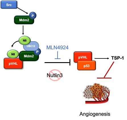 Our work shows there is a complex interplay between pVHL and Mdm2. We found that Mdm2 will bind directly to pVHL and conjugate a ubiquitin-like polypeptide, a protein called neural precursor cell expressed developmentally downregulated 8 (nedd8), under hypoxic conditions. This is the first time anyone has shown that Mdm2 can neddylate pVHL and identifies another tumor suppressor that Mdm2 regulates. The lysine that Mdm2 conjugates nedd8 to is in the region required for binding to p53 and therefore prevents the formation of a p53-pVHL complex. We also show that the binding of pVHL to p53 is needed for the activation of antiangiogenic factors in response to hypoxia. By blocking the neddylation of pVHL (genetically or pharmacologically with pevonedistat/MLN4924), the antiangiogenic factors can be induced which requires wild type p53. Re-engaging the antiangiogenic pathway diminished angiogenesis. Interestingly, using the small molecule Nutlin3, which targets the binding of Mdm2 to p53, increased p53 and Mdm2, but induction of antiangiogenic genes was absent. These data demonstrate that p53 activity is highly regulated through interaction with other proteins to induce specific genes that regulate a myriad of cellular functions. Thus, it cannot be assumed that increased p53 will retain ability to activate all target genes. Our overall finding is that under conditions that induce the neddylating activity of Mdm2, there is an indirect impact on p53 to promote angiogenesis through Mdm2 regulation of pVHL.
