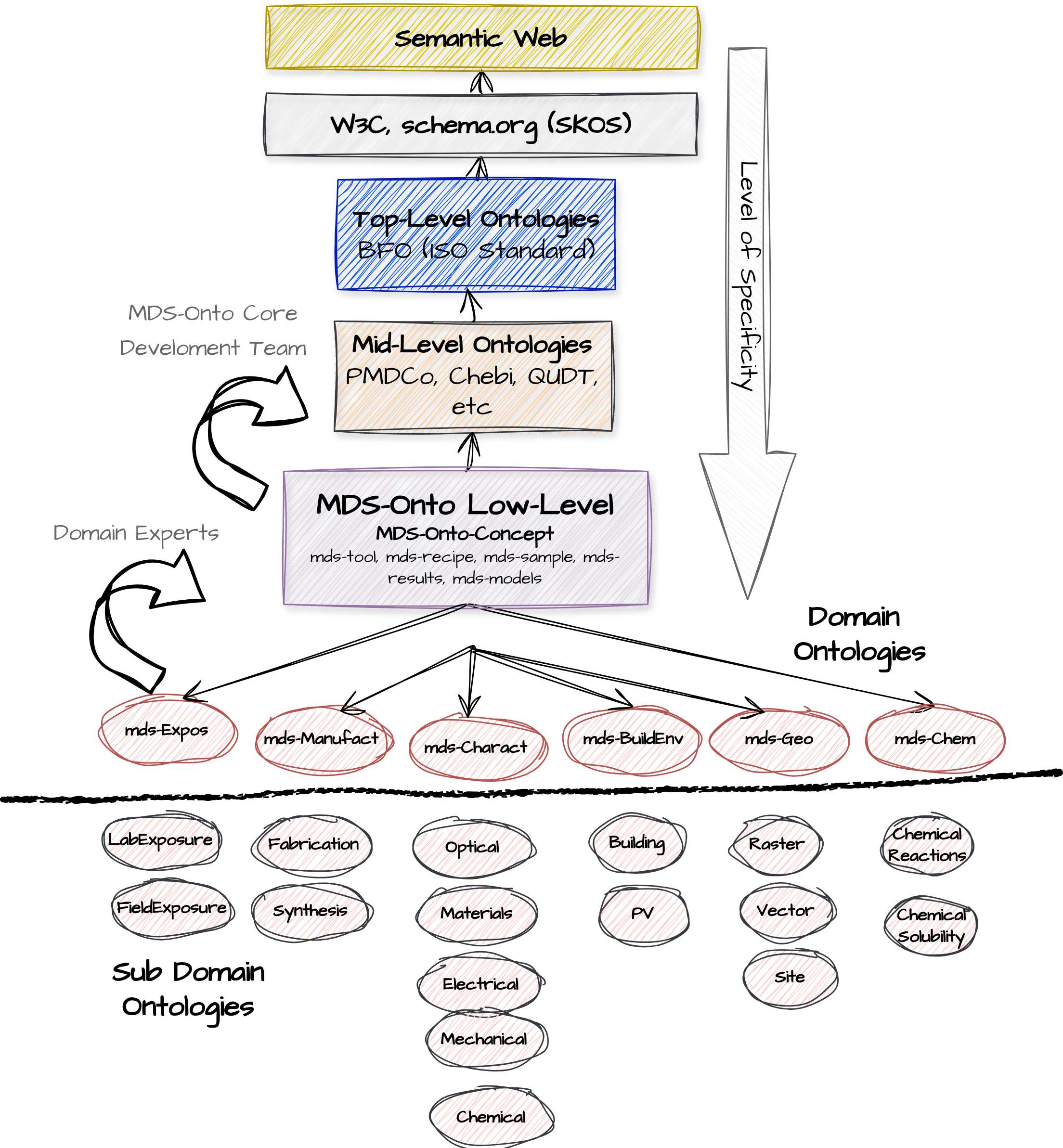 MDS-Onto is a low-level and modular ontology for the domains of Materials and Data Science. Our approach to modularize MDS was created to simplify the process of terms alignment, which can be challenging depending on the alignment level and the user’s experience in ontology development. Creating modular ontologies simply means that we map our terms to MDS-Onto Concepts that were previously mapped to other mid-level ontologies, such as PMDco. If one wants to map the instrument model variable, for instance, they can map the model to mds-tool (concept layer), which is a subclass of pmd:ProcessingNode from PMDco.