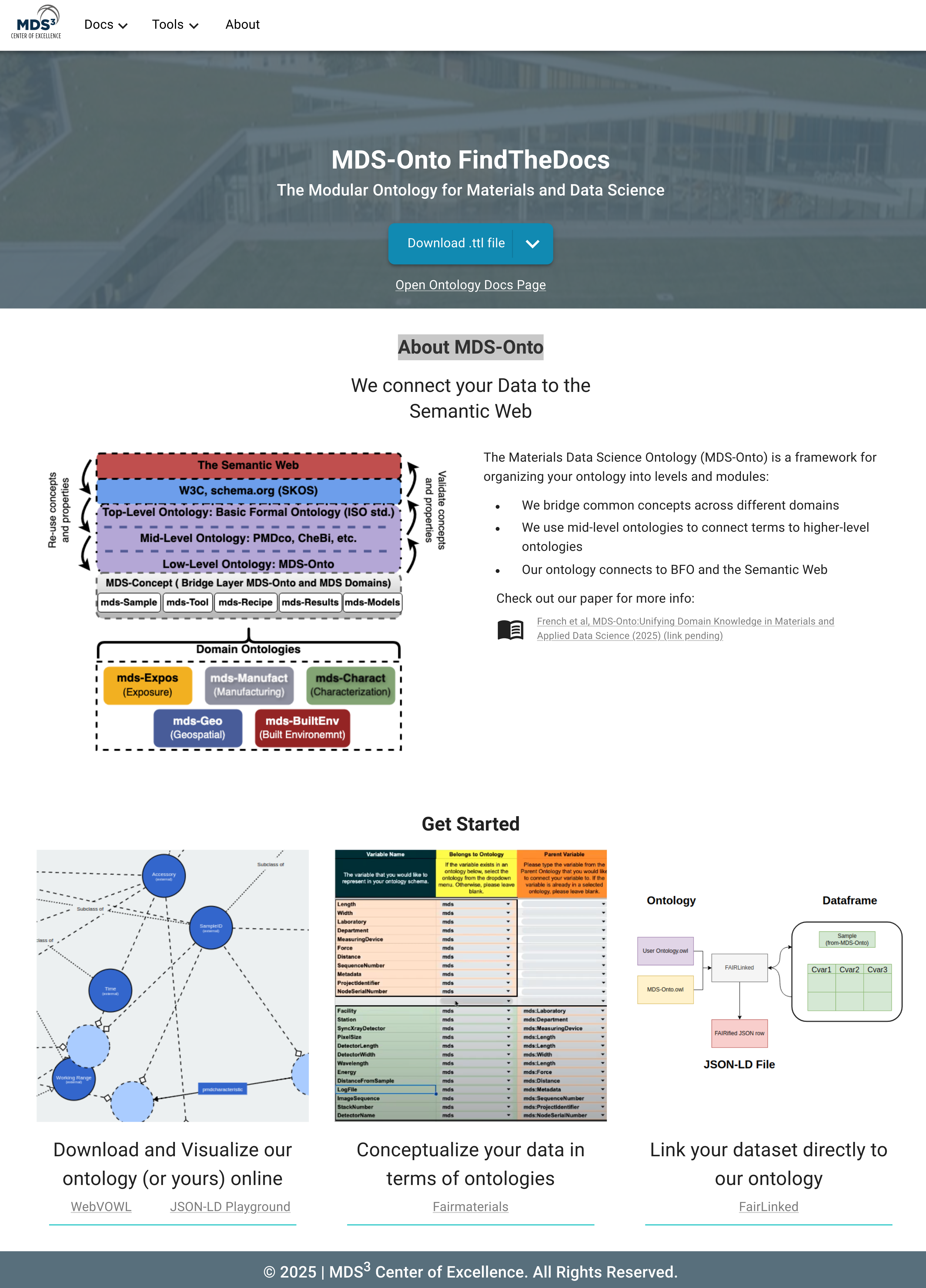 Our MDS-Onto Framework has 3 main components in addition to the MDS-Onto Ontology: FAIRmaterials, a bilingual (R/Python) software package used for ontology creation, visualization, and documentation using a simple interface based on a .csv template. Users populate the .csv file with domain/subdomain terms and map these directly to mds: (or to mid-level ontologies), run FAIRmaterias, and it generates ontology files (.ttl, .owl), an image for visualization, and an .html webpage of ontology documentation. The second component of the MDS-Onto framework is FAIRlinked, a Python package that uses MDS-Onto, translates .csv data into FAIRified .jsonld linked data. While MDS-Onto FindTheDocs, the third component of our framework, is a website for ontology visualization using the WebVOWL graph exploration tool and JSON-LD Playground for .jsonld validation and full MDS-Onto documentation. MDS-Onto FindTheDocs is also where users can download the up-to-date MDS-Onto Ontology files. A snapshot of MDS-Onto FindTheDocs can be seen in Figure 2. Figure 3 illustrates how FAIRlinked uses MDS-Onto Ontology and raw data to create .jsonld linked data.