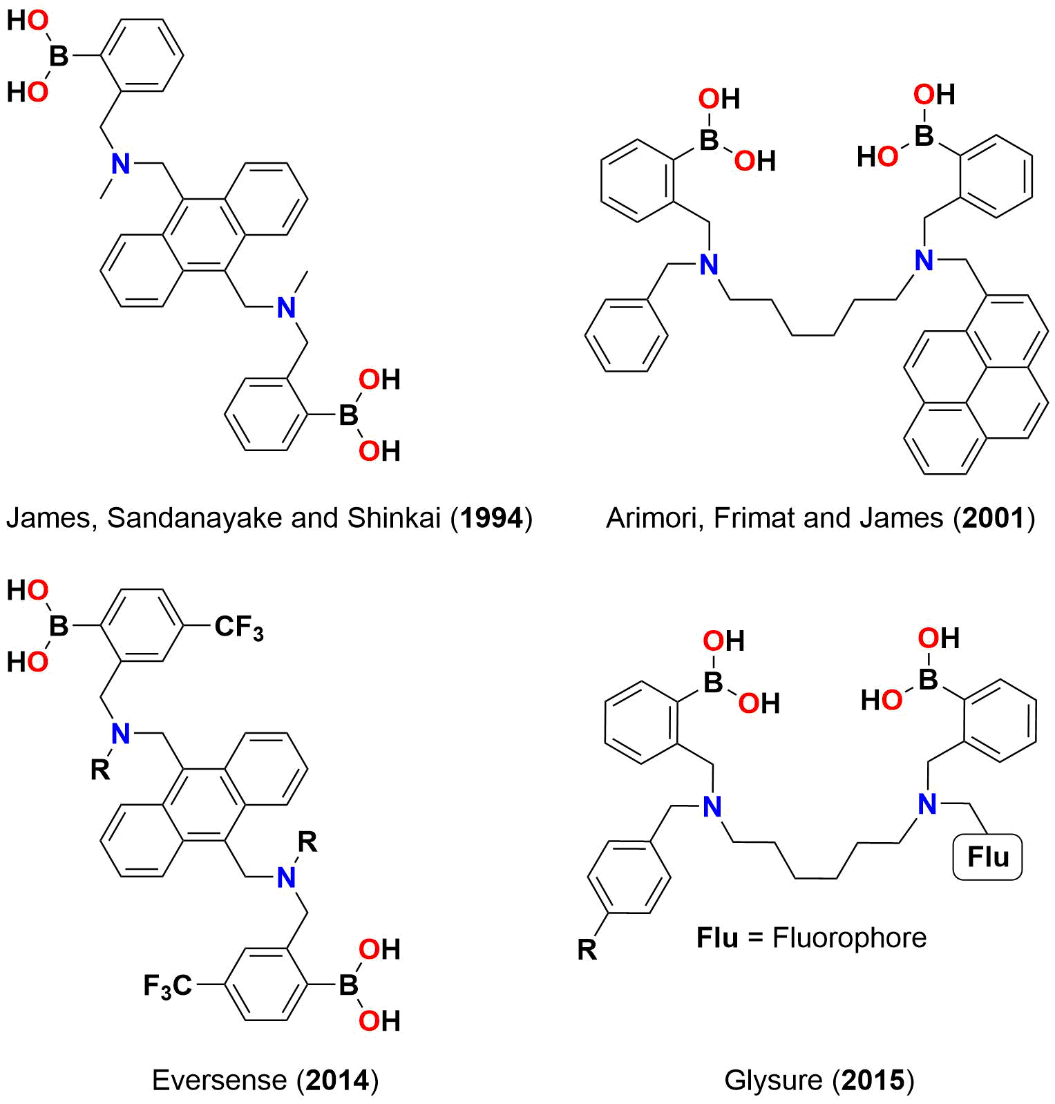 Therefore, while the scientific debates were raging between Anslyn, James and Wang on the mechanisms of action of fluorescent ortho-aminomethylphenylboronic acids, several shrewd commercial ventures recognised the importance of an ortho-aminomethylphenylboronic acid system for the development of practical CGM systems. Since, an ortho-aminomethylphenylboronic acid is a chemosensor (a term introduced by Anthony W. Czarnik to describe chemical receptors), it would be stable unlike the glucose oxidase enzyme component of traditional electrochemical based glucose sensors.