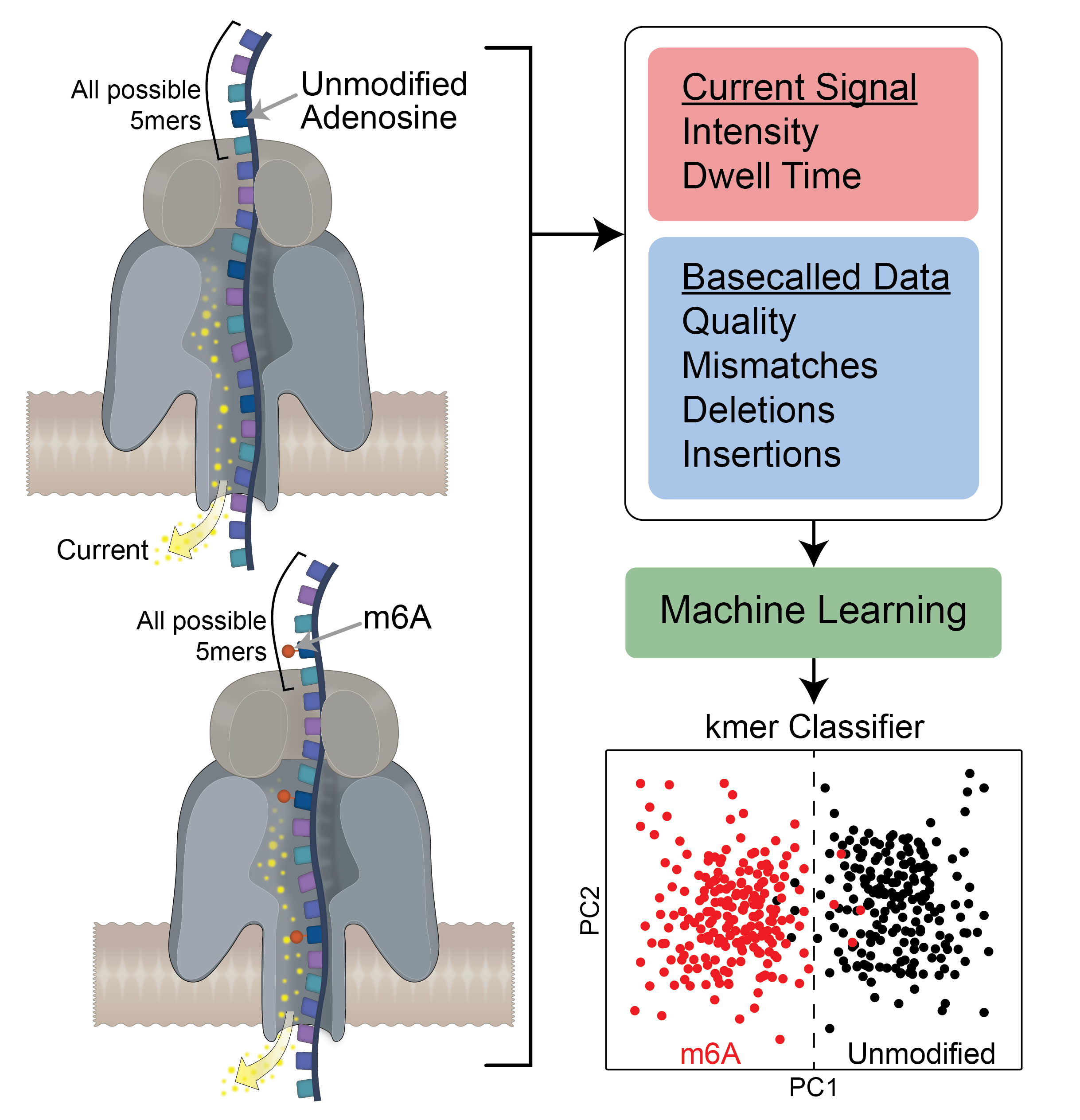 To answer this question, we must first understand how nanopore sequencing works. ONT relies on the use of membrane-embedded protein pores –-the ‘nanopores’-- which are coupled to highly sensitive ammeters that measure ionic current passing through the pore. As a molecule (DNA or RNA) moves through the pore, the sensor measures characteristic disruptions in current, which can then be used to identify the transiting nucleotides -–including modified nucleotides--. The current intensity changes are then converted into base-called nucleotide sequences using an algorithm [8].