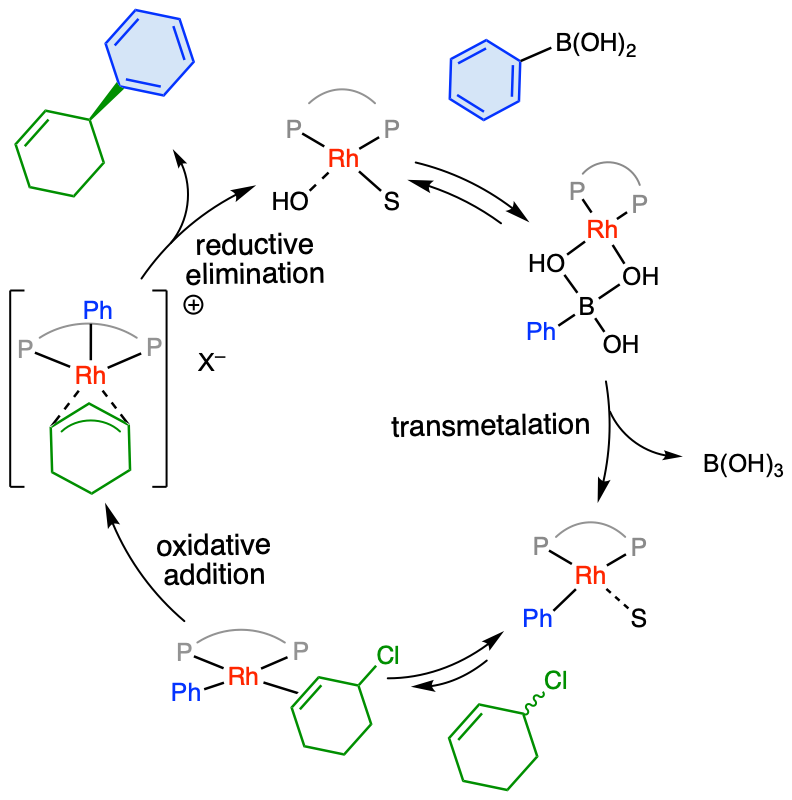 A variety of techniques, both theoretical and experimental, were employed in this multifaceted study to elucidate the mechanism of this rhodium-catalysed allylic arylation of racemic halides with arylboronic acids. We anticipate that this study will contribute towards the wider understanding of rhodium-catalysed asymmetric allylic addition reactions and asymmetric chemistry with racemic substrates in general.
