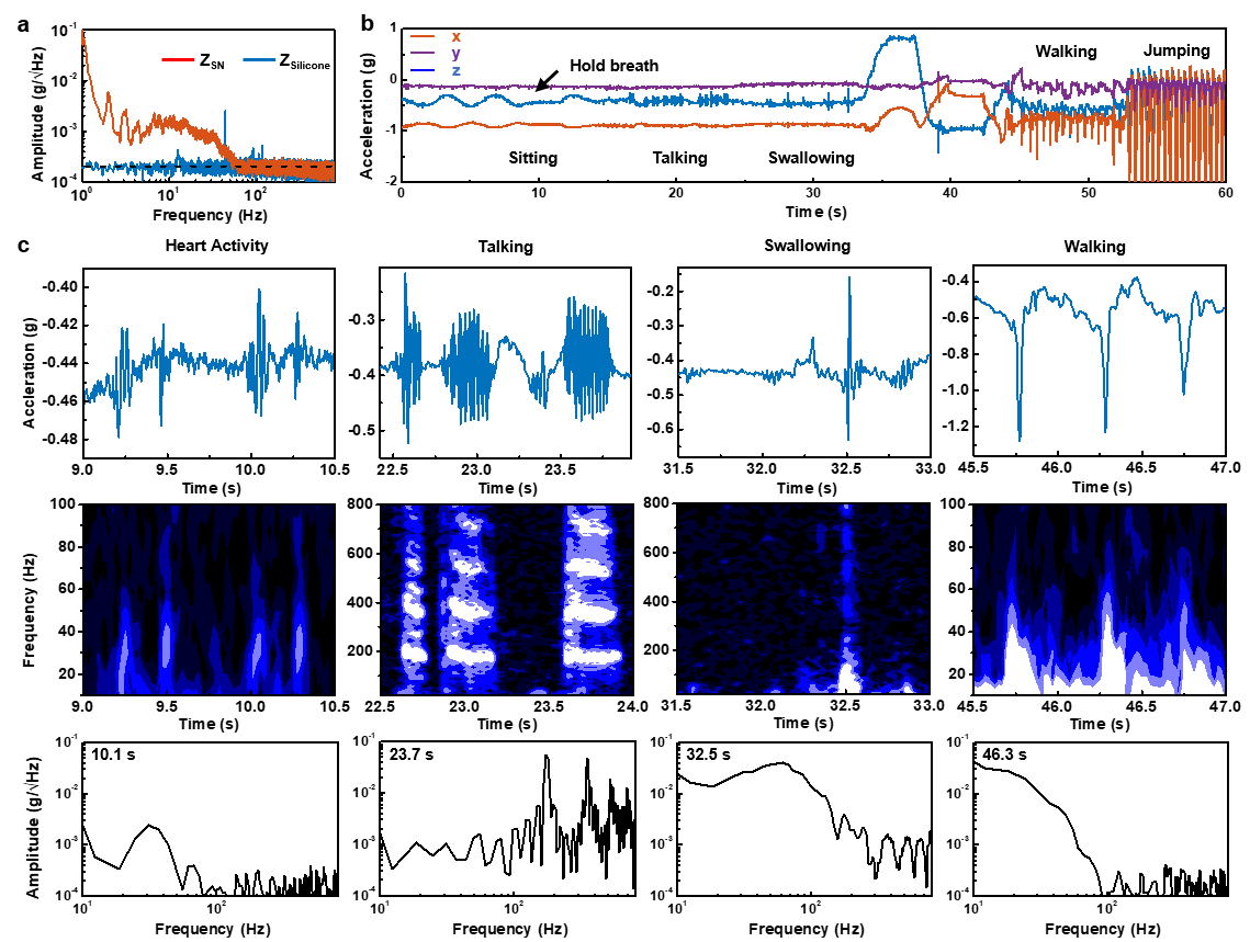 The captured physiological information and the system noise superpose onto each other in the measured acceleration signal. To parse out the rich set of underlying physiological information, we first assessed the sensor noise level (a). Power spectral density of the z-axis accelerations collected from a device vertically resting on an elastomer is compared to that of a device interfacing to the suprasternal notch of a subject sitting quietly. The results show that the system noise level is about 10-3 g/√Hz. The comparison also highlights that various homeostatic physiological events induce measurable signals in the 0 – 100 Hz range and have a significantly higher power level than the system noise. We then gathered multiple non-periodic voluntary acceleration signals to study the unique characteristics and features of physiological signals (b). Each of the signals, whether voluntary or involuntary, show distinct frequency and time-domain characteristics (c). Visualizing both time domain and frequency domain information via spectrogram analysis, we see that the heart activity signals are composed of periodic 20 to 50 Hz bursts. For a talking signal, the spectrogram features a harmonic series across a wide band. The swallowing signal comprises sequential events, including low-frequency laryngeal movement followed by the wide-band sound of food going down the esophagus. The walking signal has relatively large amplitude, low-frequency accelerations. Using these features, we developed an algorithm that derives heart rate, respiration rate, energy expenditure, swallow counts, and talk time.