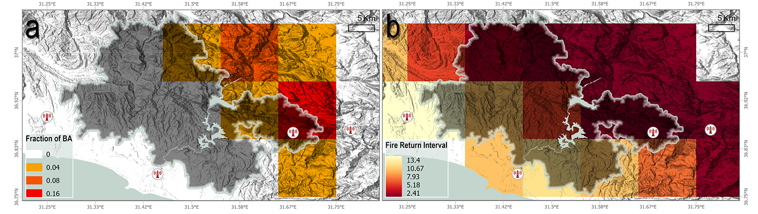 4 years ago, on July 28, a multiple ignition fire started in a pyro-catchment in Mediterranean Türkiye. With the help of strong foehn winds that were blowing the hot and dry air of the Anatolian Plateau over the Taurus Mountains, relative humidity dropping below the critical threshold and temperatures rising, the fire quickly spread. The initial ignitions were four separate cases of arson. In the following days, several other fires (different arson cases and additional ignitions whose sources were unidentified) that started in the same area would challenge suppression efforts. The wildfire, later named the Manavgat Fire, resulted in the largest burned area for this region for more than a century. Between the start (July 28) and the day when the Manavgat Fire was finally contained (August 11), 60,000 ha of forest, shrubland, human settlements and agriculture land has burned, several villages evacuated, and 8 people killed.