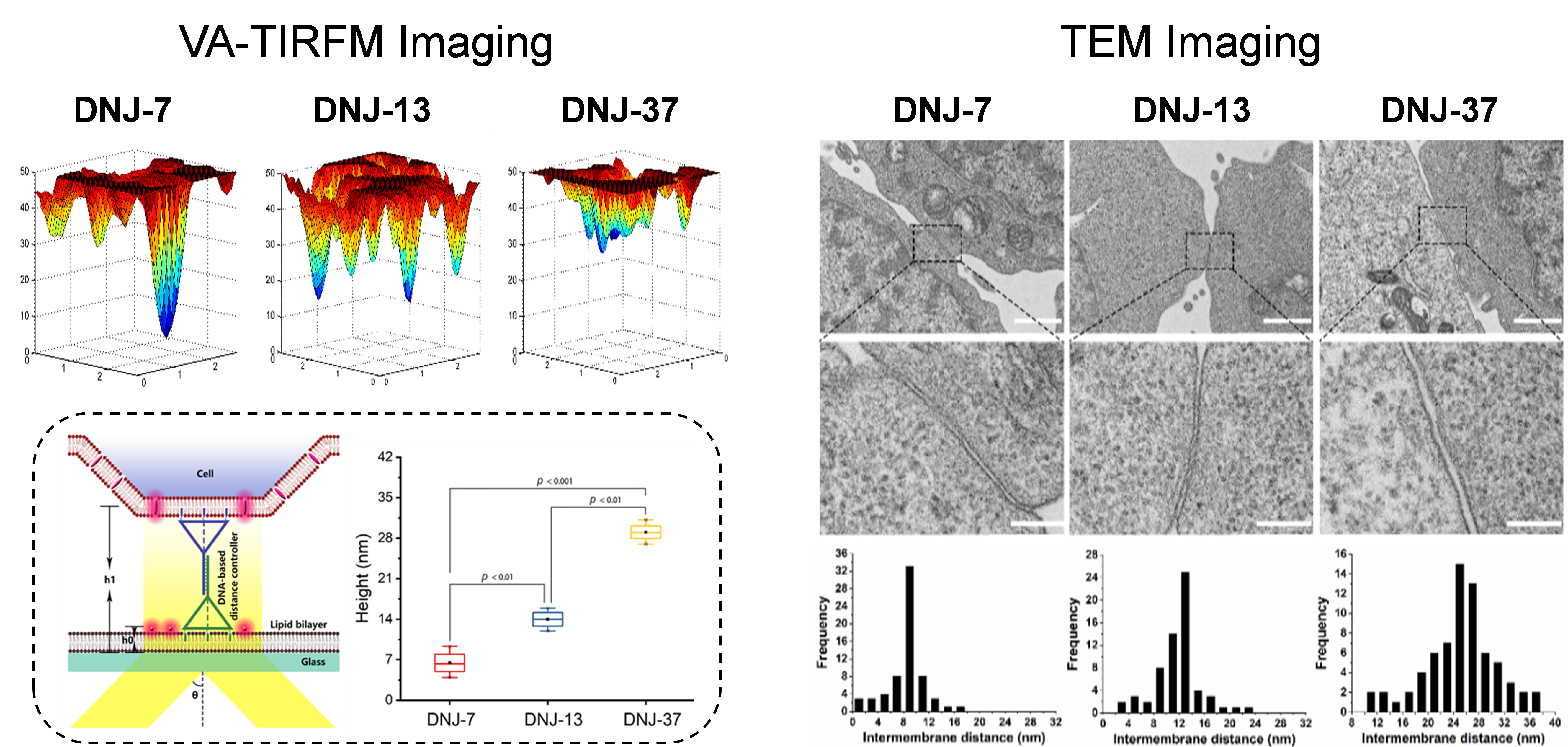 These DNJs were formed through DNA hybridization between two membrane-anchored tetrahedral DNA nanostructures (TDNs), which were constructed by DNA self-assembly with a 17-nt overhang at the top vertex and cholesterol tags at the three bottom vertices. To precisely tune the intermembrane distance, three types of DNJs, termed as DNJ-7, DNJ-13, and DNJ-37, were constructed by combining two complementary TDNs of the same size, and their theoretical heights were calculated to be 9.8, 13.0, and 26.4 nm, respectively. We first verified the successful construction of these three TDNs and their good performance for effective cell-surface engineering. Based on variable-angle total internal reflection fluorescence microscopy (VA-TIRFM) and transmission electron microscopy (TEM) imaging, the intermembrane spacing generated by DNJ-7, DNJ-13 and DNJ-37 was matched well with the expected value (Figure 2).