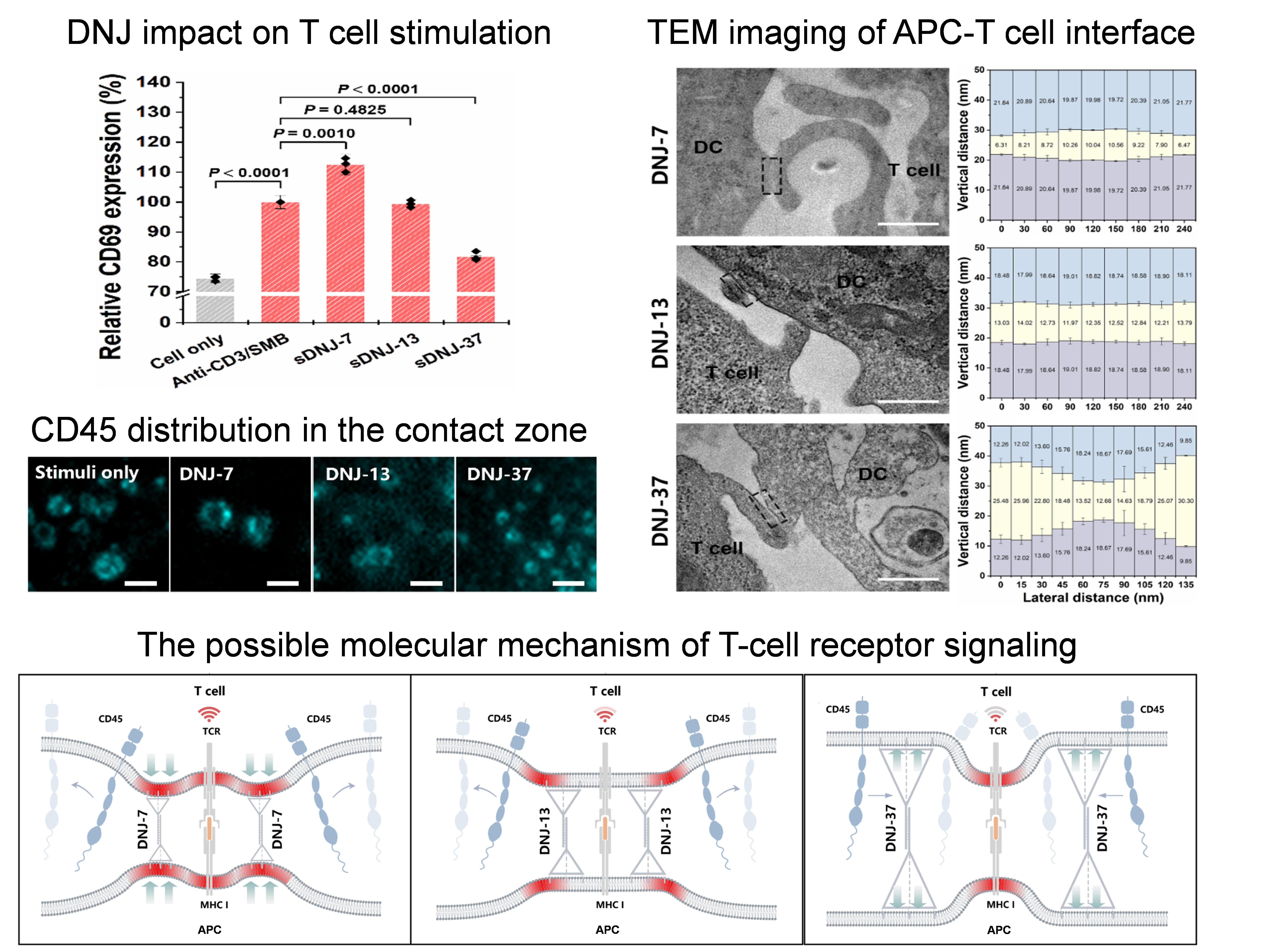 How the engagement of T-cell receptor (TCR) to antigenic peptide-loaded major histocompatibility complex (pMHC) on antigen-presenting cells (APCs) initiates intracellular signaling cascades in T cells is not well understood. The dimension of the cellular contact zone is regarded as one of the key determinants. Upon TCR-pMHC ligation, multiple accessory molecules are recruited to form regions of close contact at the interface between APCs and T cells. The small size of the TCR-pMHC complex holds the cellular contact at a short intermembrane distance of ~13 nm. Although the spatial impact of the contact zone on T cell signaling has been reported, these strategies mainly relied on reductionist models or involved changes in protein structure. It is difficult to achieve a relatively comprehensive map of this complex biological process. To address these issues, we used cholesterol-conjugated TDNs as the membrane-anchored scaffold and constructed DNA nanojunctions (DNJs) of distinct sizes to manipulate the intermembrane spacing around the TCR-pMHC dimension in a real APC-T cell interaction system, with no need to involve protein modification (Figure 1).