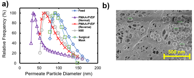 Initially, the membrane system performance was verified with polystyrene latex (PSL) particles that were easily aerosolized to mimic the size range of coronavirus particles. After filtration with PSL particles (~100 nm on average), the permeate was analyzed to determine size range of captured particles for each material (Figure 2). The developed PVDF membranes were found to filter more selectively smaller particles (<100-150 nm) than a commercial N95 and surgical mask, validating that the precise pore structure of the membrane plays a large role in coronavirus-sized particle capture. Another important factor of the membrane, though, is the pore tortuosity. Studies from the Centers for Disease Control and Prevention (CDC) have shown that membranes with non-tortuous pores have a much lower filtration efficiency than that of tortuous ones, indicating that the longer path the penetrating particle must take increases the chance of deposition and capture. Overall, Occupational Safety and Health Administration (OSHA) has a protection factor (PF) requirement of at least 10 for N95 masks, while our developed membranes were found to have a PF of 540 ± 380.