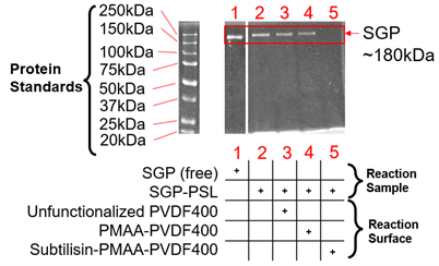 Figure 4. Characterization of particle-bound protein denaturation via enzyme interaction of functionalized membrane. Analysis of 100 nm SGP-functionalized PSL after 30 second reaction with different membrane surfaces via Sodium dodecyl-sulfate polyacrylamide gel electrophoresis (SDS-PAGE). Approximately 2.6 μg of protein was loaded in each well (except the SGP-only lane with ~5.2 μg) with reactions carried out at total protein concentrations of ~87.5 μg/mL at pH of 7.8 and 23°C. These experiments were performed in duplicate.