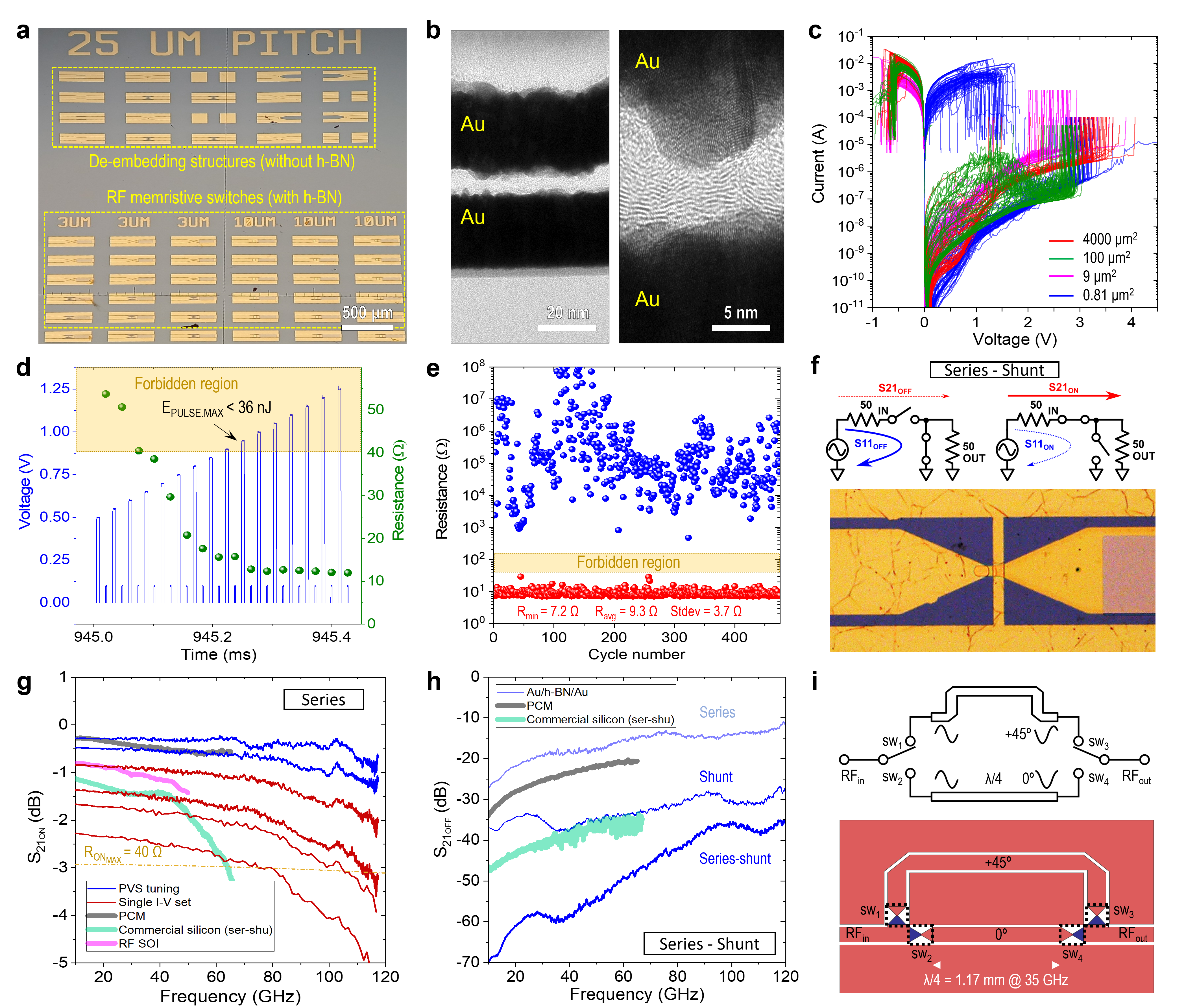 Figure 1: a, Optical microscope image of a meta/h-BN/metal array and RF de-embedding structures. b, Cross-sectional TEM images of a Au/CVD h-BN/Au device, showing layered structure. c, Characteristic I-V curves displaying at least 100 consecutive cycles for each device area. d, Conductance-enhancing protocol using 10 μs voltage pulses. e, Variability resistance through 475 cycles of a single device switched following the protocol from d. f, Circuit schematic and optical microscope image of a series-shunt Au/h-BN/Au device. g, Comparison of losses (S21.ON) between conductance-optimized Au/h-BN/Au devices, non-optimized devices and other switching technologies. h, Isolation enhancement (better than 35 dB up to 120 GHz) with series-shunt Au/h-BN/Au. i, Schematic and layout of the evaluated phase-shifter as potential use-case.