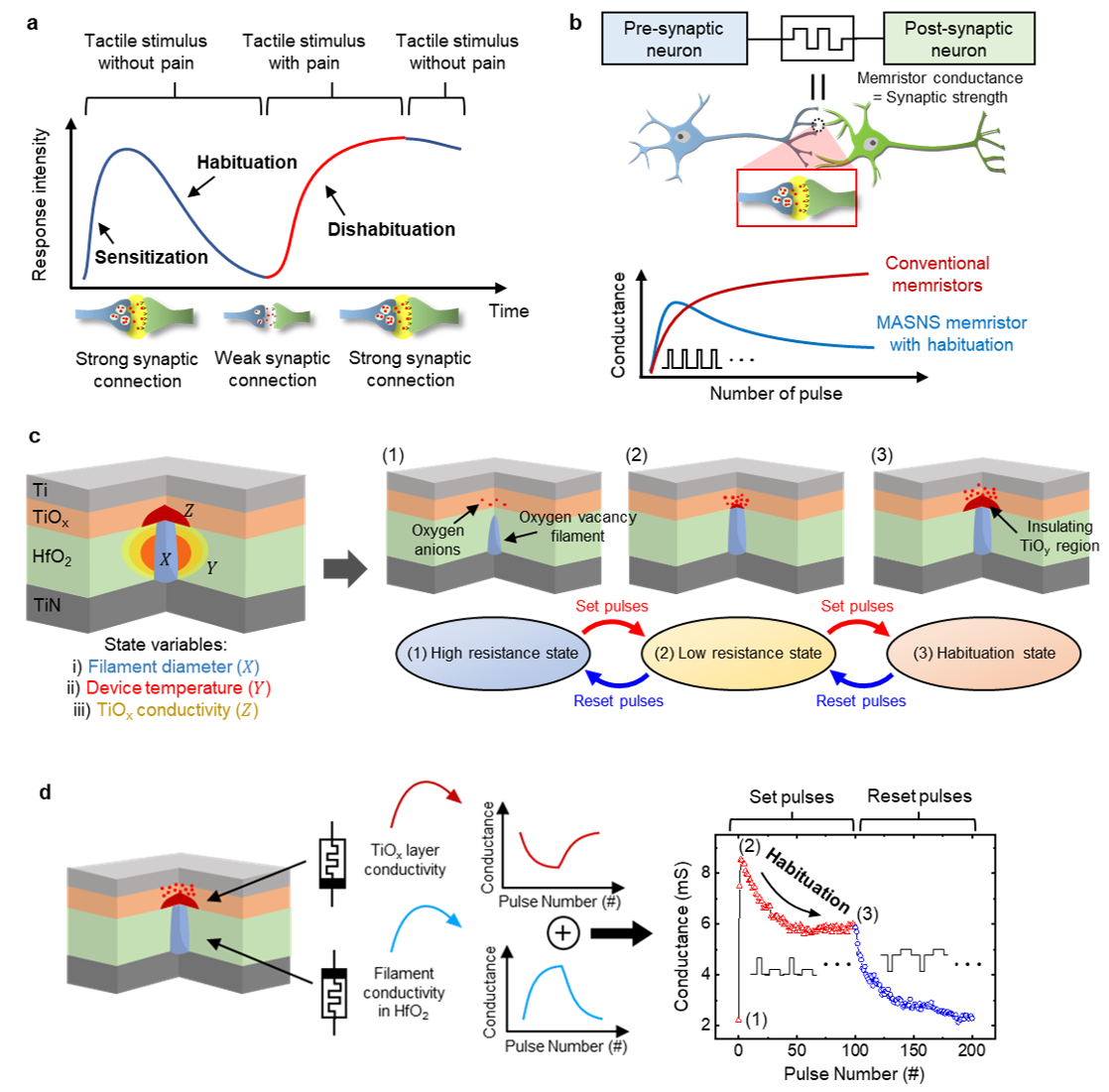 To address these challenges, researchers have attempted to develop memristor-based artificial sensory nervous systems that emulate the efficient biological sensory nervous systems found in animals. Nevertheless, replicating biological functions such as habituation and sensitization has typically required bulky peripheral circuitry. Furthermore, implementing such complex synaptic behaviors within a single device has proven difficult.  Conventional memristors exhibit low-order characteristics in which resistance changes are governed by one or two state variables, such as the size of conductive filaments and the internal temperature of the device. This leads to simple monotonic conductance updates, making it difficult to replicate functions requiring non-monotonic updates in response to identical stimuli, such as habituation.