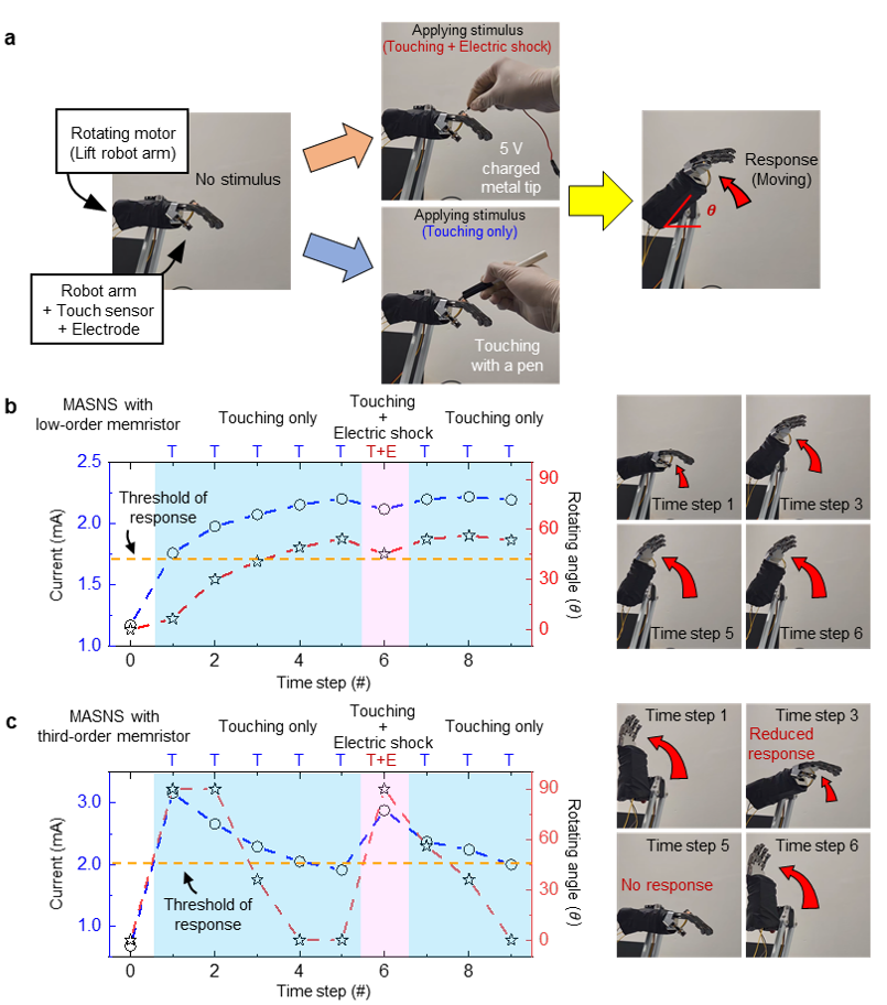Based on the device, we constructed a memristor-based artificial sensory nervous system capable of receiving tactile stimuli and electrical shock (pain stimuli) and applied it to an actual robotic system (robot arm) to demonstrate energy-efficient neuro-inspired robotics. When repeatedly subjected to harmless tactile stimuli, followed by painful stimuli, we observed that the robotic arm gradually became less responsive to the harmless stimuli via habituation, while responding sensitively to the painful stimuli — closely mimicking animal-like sensory processing. This result confirms that, even without additional processor intervention, the system could selectively respond to important stimuli while ignoring unimportant ones, thereby reducing processor workload. Through this work, we experimentally demonstrated the feasibility of neuro-inspired robotics that replicate the efficient peripheral nervous systems of biological organisms, surpassing the limitations of conventional robotic systems.