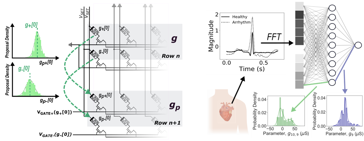 We also contacted the research group of Damien Querlioz at Université Paris-Saclay, well known for their non-conventional use of resistive memory devices for the calculation of joint probabilities by Bayes rule, and proposed that we collaborate on this topic. Happily Damien accepted and, over the next year, we spent a great deal of our time working together; discussing, head-scratching and planning experiments. One such experiment, the device endurance study that become a highlight of our paper, very nearly never was - due to the onset of the Covid-19 pandemic. As the initial wave of the pandemic swept across Europe, CEA-Leti announced the closure of the facility the night before our experiment, started two weeks earlier, was due to finish. Myself and Niccolo arrived to the laboratory (at an unholy hour) the next day and, against the backdrop of our colleagues scrambling to get their own work in order, we managed to conclude the experiment and get our data with seconds to spare. The cherry on top of the cake were the results of a design project undertaken by two of Damien’s PhD students, Clement Turck and Kamel-Eddin Harabi, during the subsequent lockdown. Ironically, this may not have been possible if their own work plans had not also been complicated by the pandemic. Kamel and Clement found that, to train a full Bayesian neural network, a memristor-based Markov chain Monte Carlo sampling chip would require only a few micro Joules of energy – about as much as a single biological neuron firing fewer than ten times. Most importantly, this amounted to a five order of magnitude reduction with respect to an implementation of the same algorithm using a state of the art microprocessor - the difference in height between the tallest building in the world, the Burj Kalifa in Dubai, and a five-cent piece lying on the ground next to it.