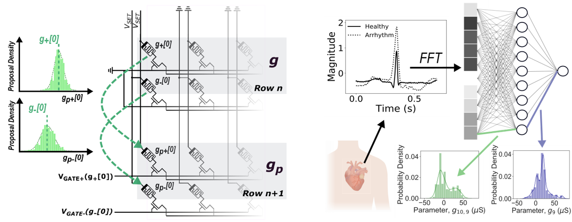 We also contacted the research group of Damien Querlioz at Université Paris-Saclay, well known for their non-conventional use of resistive memory devices for the calculation of joint probabilities by Bayes rule, and proposed that we collaborate on this topic. Happily Damien accepted and, over the next year, we spent a great deal of our time working together; discussing, head-scratching and planning experiments. One such experiment, the device endurance study that become a highlight of our paper, very nearly never was - due to the onset of the Covid-19 pandemic. As the initial wave of the pandemic swept across Europe, CEA-Leti announced the closure of the facility the night before our experiment, started two weeks earlier, was due to finish. Myself and Niccolo arrived to the laboratory (at an unholy hour) the next day and, against the backdrop of our colleagues scrambling to get their own work in order, we managed to conclude the experiment and get our data with seconds to spare. The cherry on top of the cake were the results of a design project undertaken by two of Damien’s PhD students, Clement Turck and Kamel-Eddin Harabi, during the subsequent lockdown. Ironically, this may not have been possible if their own work plans had not also been complicated by the pandemic. Kamel and Clement found that, to train a full Bayesian neural network, a memristor-based Markov chain Monte Carlo sampling chip would require only a few micro Joules of energy – about as much as a single biological neuron firing fewer than ten times. Most importantly, this amounted to a five order of magnitude reduction with respect to an implementation of the same algorithm using a state of the art microprocessor - the difference in height between the tallest building in the world, the Burj Kalifa in Dubai, and a five-cent piece lying on the ground next to it.