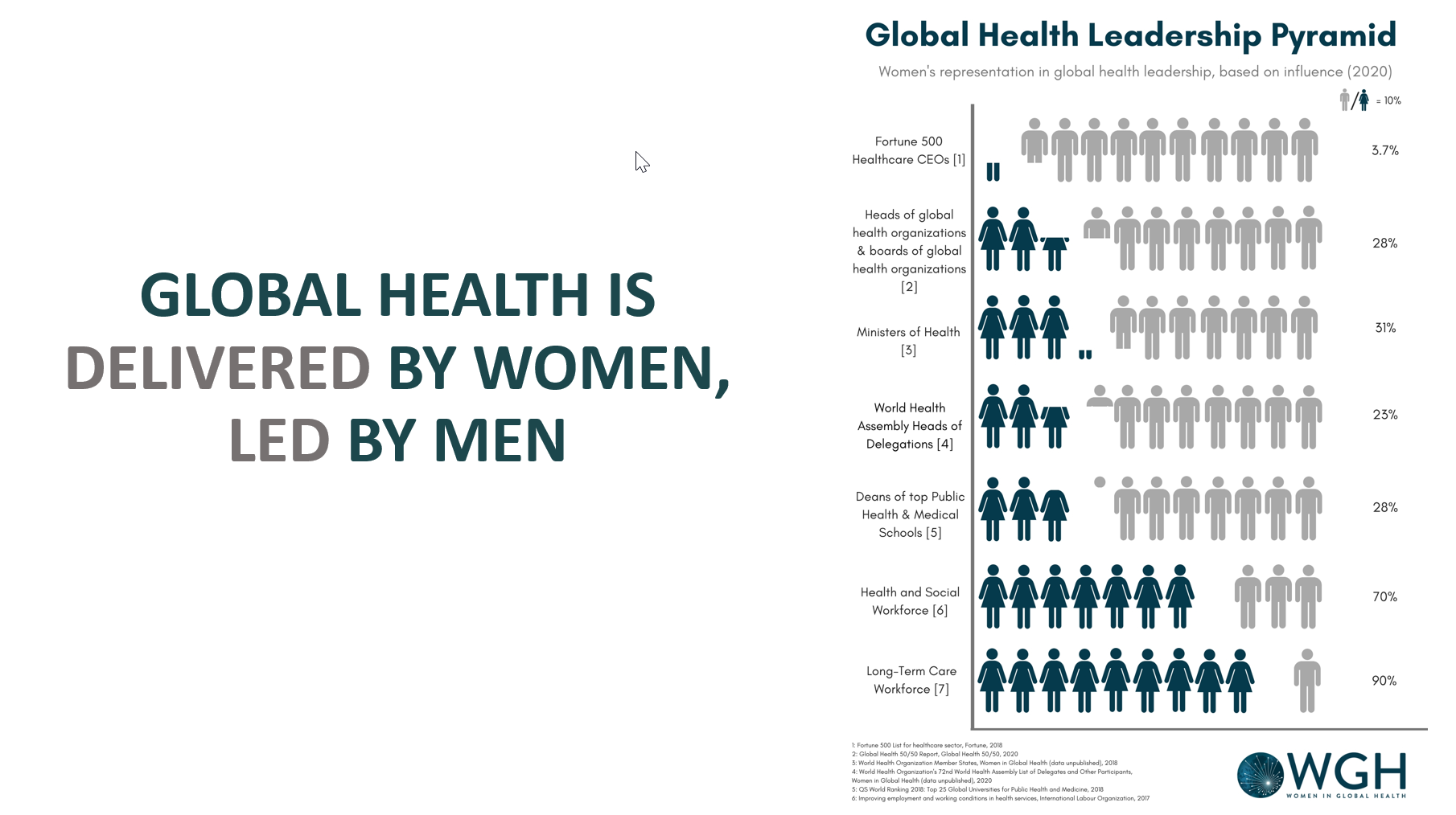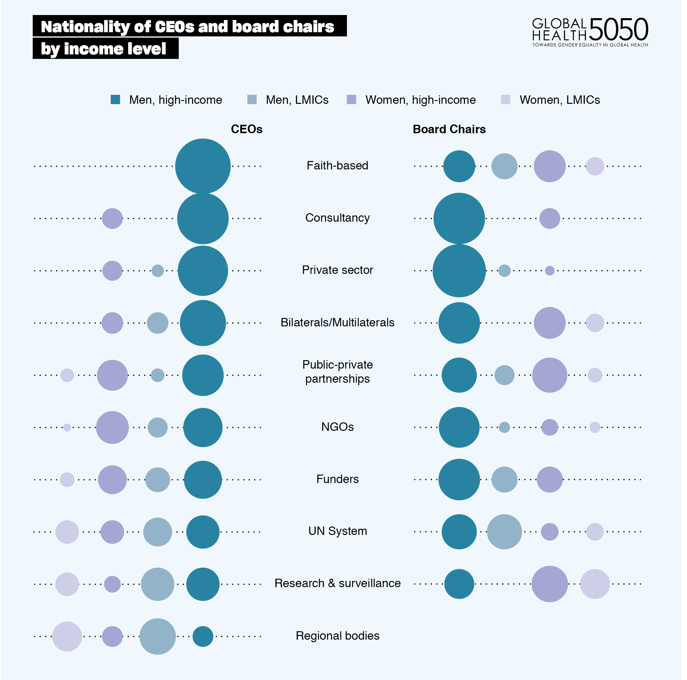 Global health today is neither global nor diverse. There is good data to show that every aspect of global health is dominated by individuals, institutions and funders in high-income countries (HICs). The Global Health 50/50 report found that more than 70% of leaders in the sample of 200 global health organizations are men, more than 80% are nationals of HICs and more than 90% were educated in HICs. A typical CEO of a global health agency is 3-times more likely to be a male, 4-times more likely to be from a HIC, and 13-times more likely to have been educated in a HIC. Global health is delivered by women, but led by men (graphic, courtesy Women in Global Health).