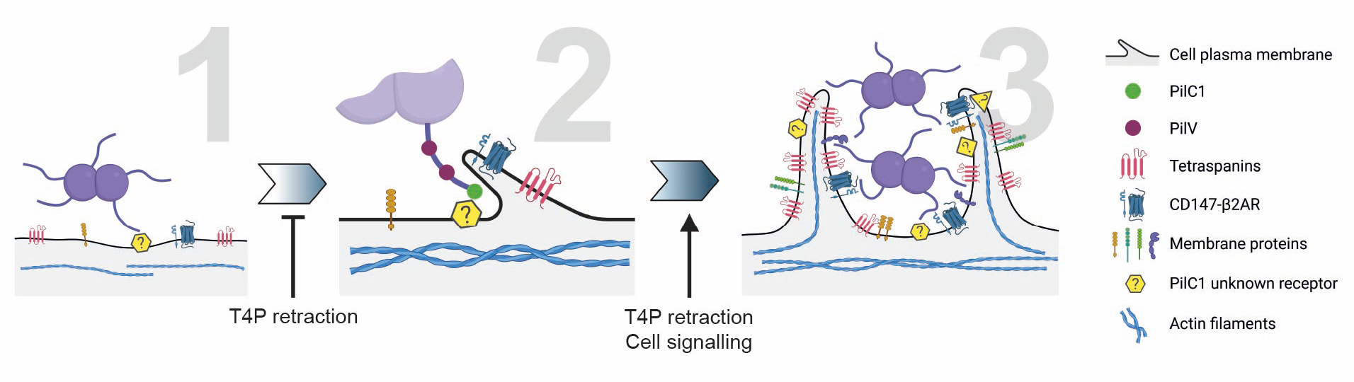 - Initiation: PilC1 binds to endothelial cell membranes (via a host receptor that is still unknown, probably present in numerous copies, such as a sugar), triggering membrane wetting and TMS formation.