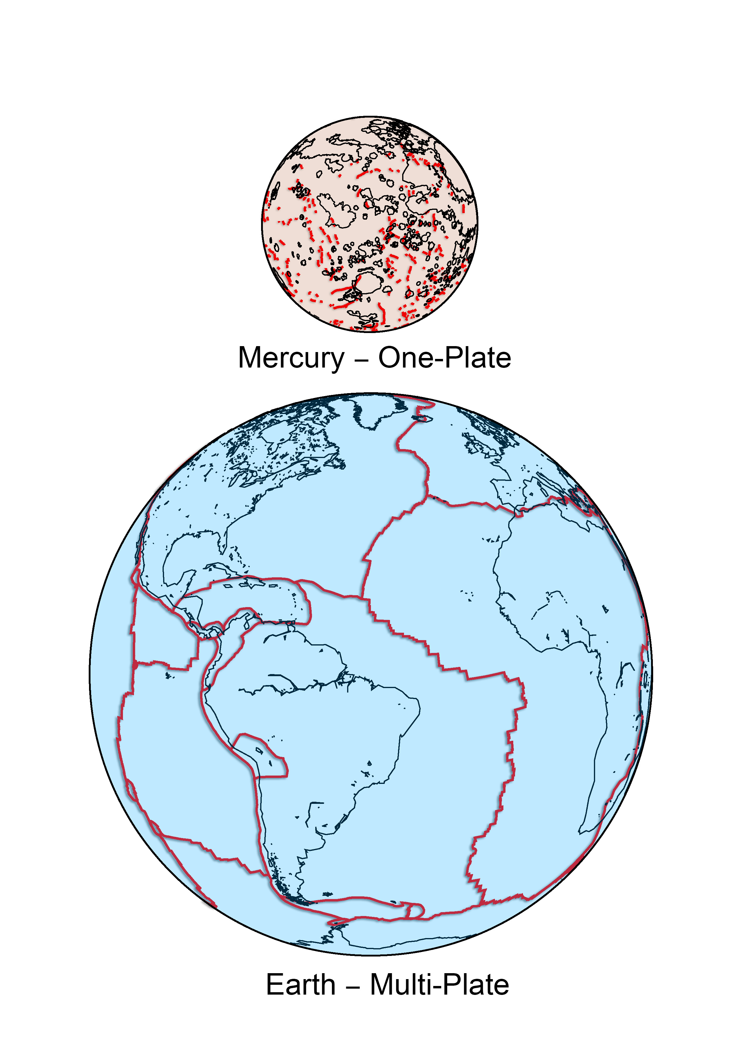Multi-Plate and One-Plate Planets. Earth’s lithosphere, its rigid outer shell, is broken into 12 individual plates (red lines). Movement of these fault bounded plates is propelled by mantle convection, a mechanism driven by heat loss from Earth’s interior. Earth’s coast lines are shown (black lines). Mercury’s lithosphere by contrast, is a single, continuous plate that has been broken by many widely distributed faults (red lines). These faults are the result of global contraction driven by loss of heat from Mercury’s interior. Mercury’s smooth volcanic plains are shown (black lines).