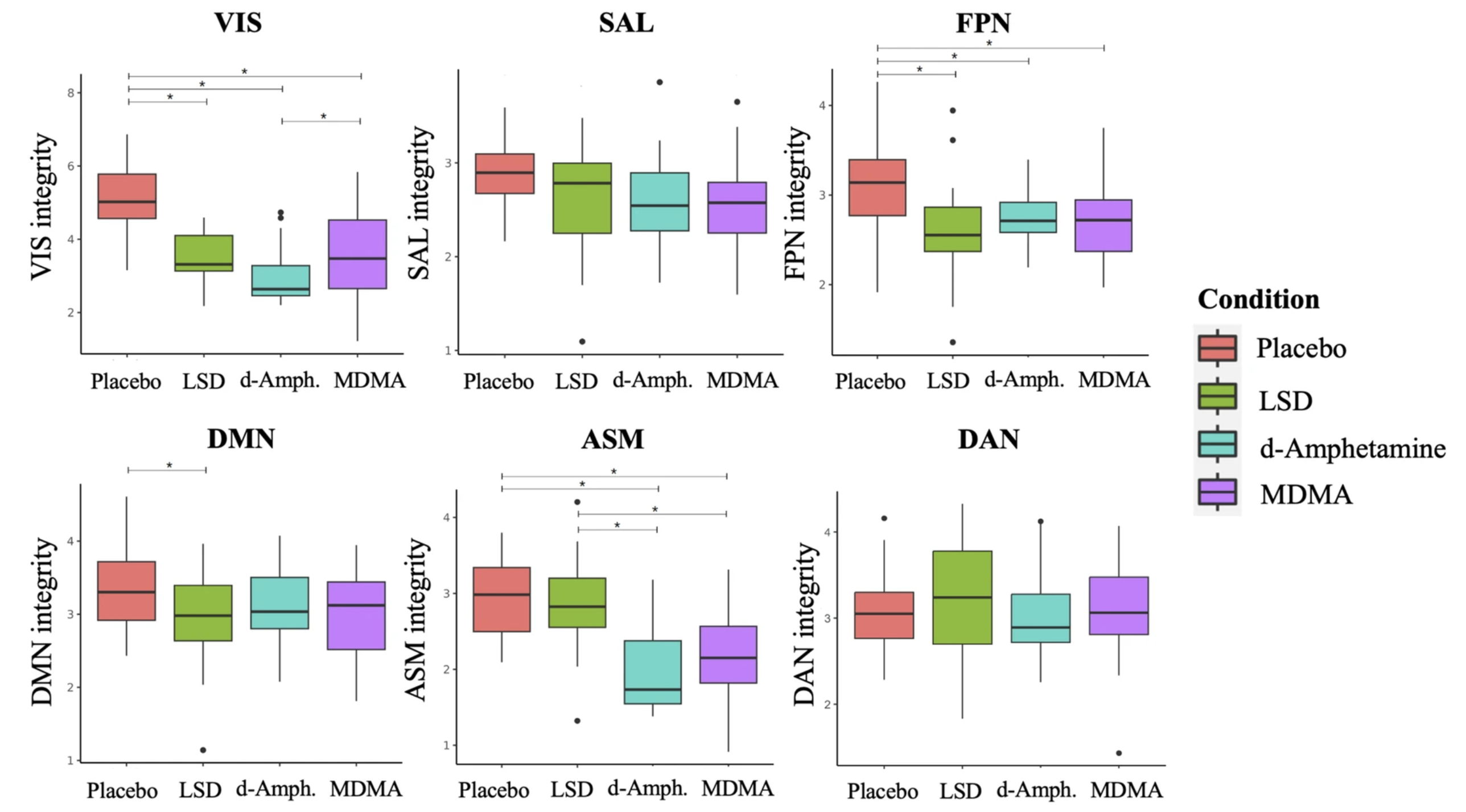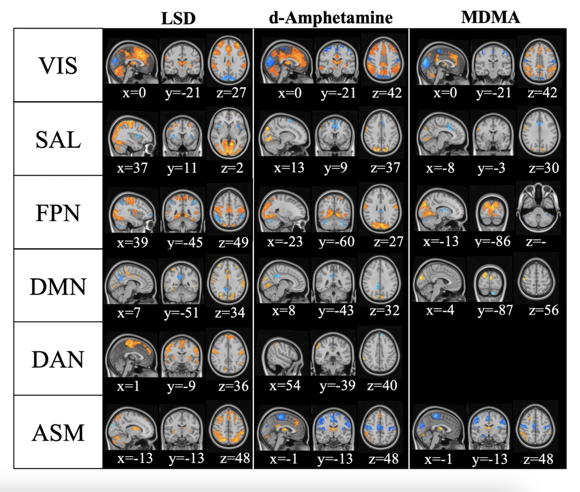 One reason for the uncertainty surrounding psychedelics lies in their neuropharmacological complexity, which affect various neurotransmitter systems and have broad downstream effects. Comparative studies of related substances—those impacting similar neurotransmitter systems and producing parallel alterations in consciousness—may help elucidate the neurobiological mechanisms underlying psychedelics. To this end, our study compared a prototypical psychedelic (lysergic acid diethylamide, or LSD), a stimulant (d-amphetamine), and an entactogen (3,4-methylenedioxymethamphetamine, or MDMA) concerning their effects on large-scale brain connectivity. Alterations in connectivity are believed to underpin the modulatory effects of neurotransmitters6. Therefore, common connectivity changes induced by these substances could suggest shared effects on neurotransmitter systems or on downstream processes. Conversely, distinct connectivity changes might indicate the modulation of different pathways by these compounds. For example, while all these substances influence the dopaminergic system (though to varying extents), d-amphetamine primarily targets this system, MDMA’s effects are more pronounced on the serotonergic system, and LSD acts agonistically on serotonergic 2A receptors (5-HT2AR).