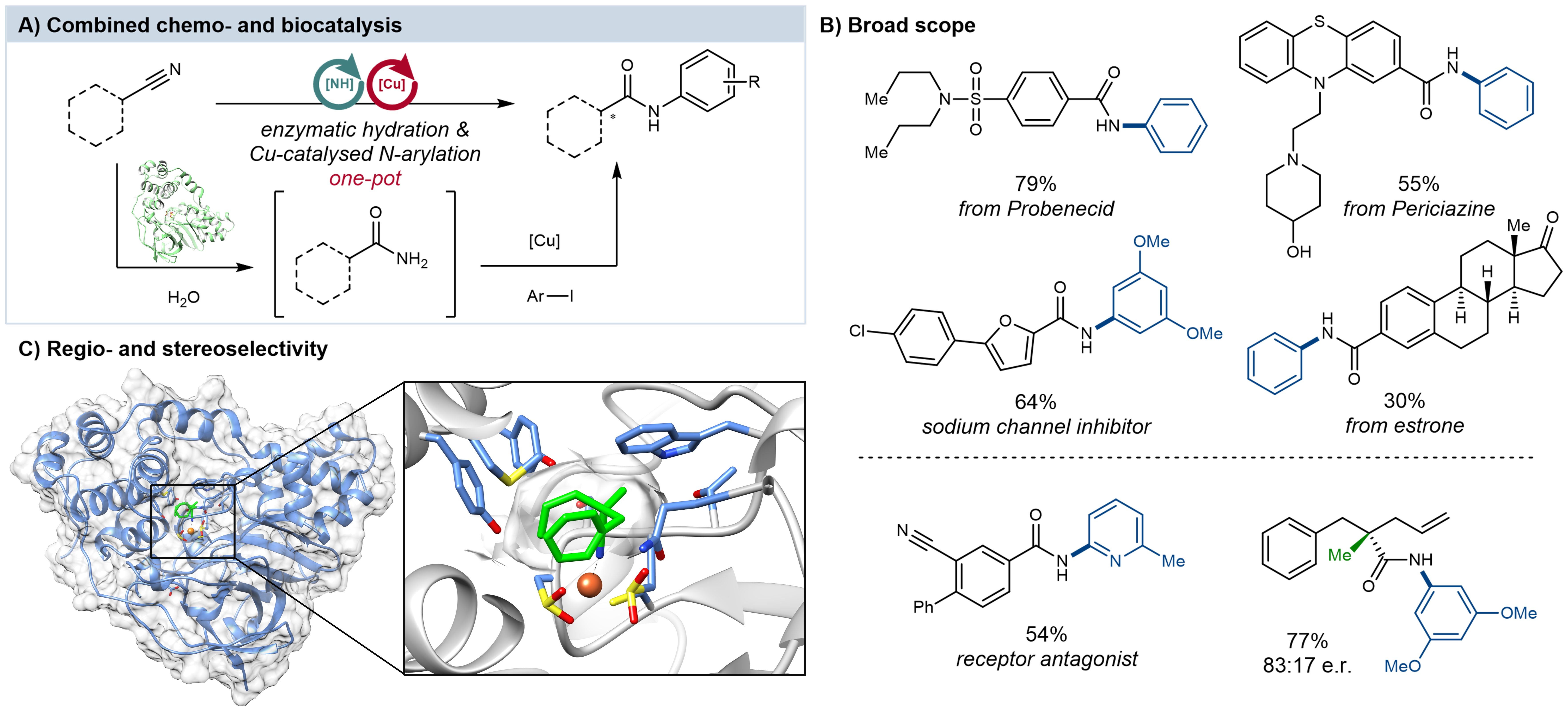 Figure 1: Integrated amide bond synthesis by combining enzymes and chemocatalysts. A) General concept for the integrated amide synthesis. B) Selected examples of the scope. C) NHase structure accommodating nitrile substrate. Regio- and stereoselectivity was applied for the selective synthesis of bioactive compounds and chiral amides.