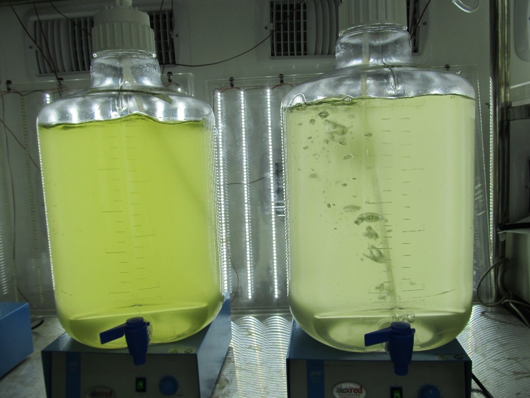 Growing 20 l E. huxleyi cultures for EV production. On the left is a control culture, on the right is a culture 24 hours post infection with EhV.