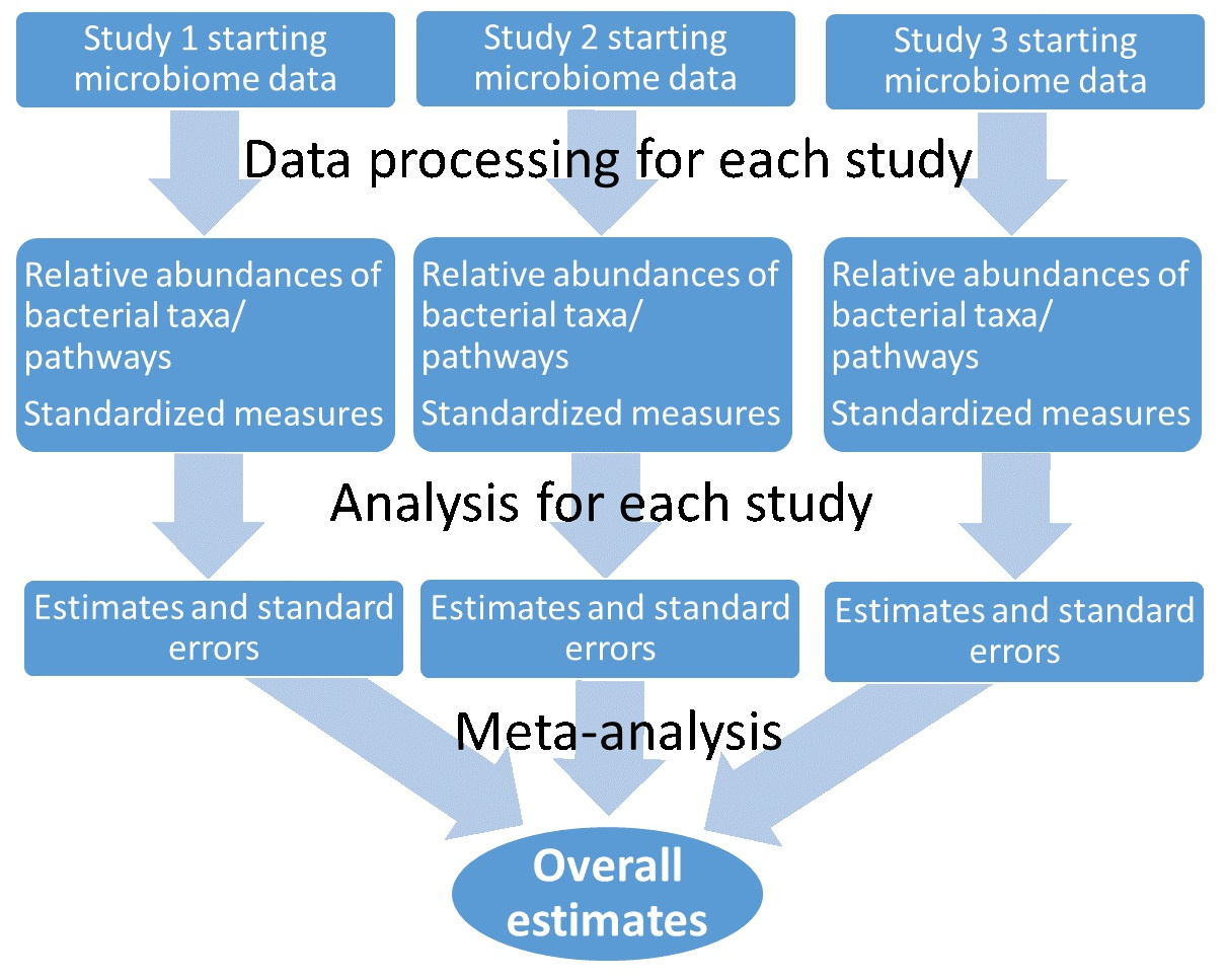 Undertaking this meta-analysis required us to overcome several challenges. First, differences in study design (e.g. longitudinal, cross-sectional), experimental protocol (e.g. amplicon region, PCR and sequencing design), and data analysis (e.g. preprocessing and filtering strategies, OTU picking versus raw sequence reads) necessitated a unified analytic approach and “flattening” of the data to be directly comparable across studies. This is a known issue in 16S rRNA amplicon-based microbiome studies. Second, although quite a few microbiome meta-analysis studies have been done, none have addressed overall pooled effects for between group comparisons (e.g. overall comparison between non-EBF vs. EBF across studies in our context). Therefore, we applied and implemented a method for analysis of relative abundance of bacterial taxa and pathways that allow handling of proportional data and accounting for the inflation of zero values, flexibility for different study designs (longitudinal, cross-sectional) and adjustment for confounders. Next, the meta-analysis approach that we applied is based on the comparable estimates across studies and allows examination of study-specific effects, the heterogeneity between studies, and the overall pooled effects across studies. Finally, much effort was spent building the collaboration and we appreciate the generosity of the groups who shared their pre-publication data for the purposes of meta-analysis as well as to demonstrate that this approach would work on extremely diverse data sources. We hope that making all of our analysis code publicly available via Github will encourage further collaborative efforts to utilize the plethora of microbiome data that have already been generated.